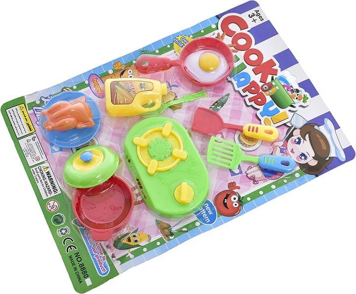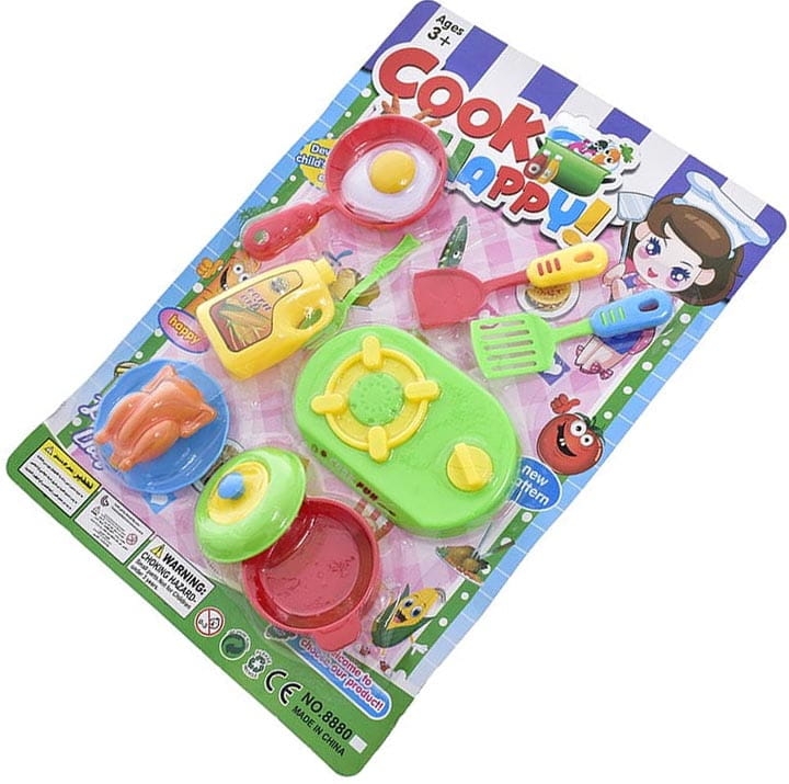 Zestaw zawiera: kuchenkę, garnek z pokrywką, sztućce 3 szt., patelnię z pokrywką, talerzyk z kurczakiem.