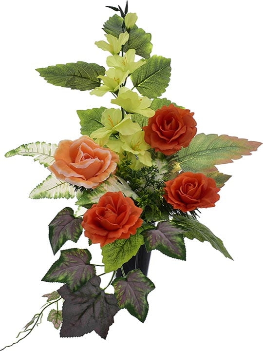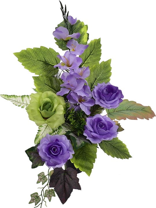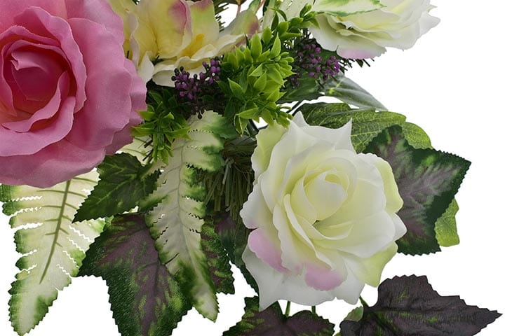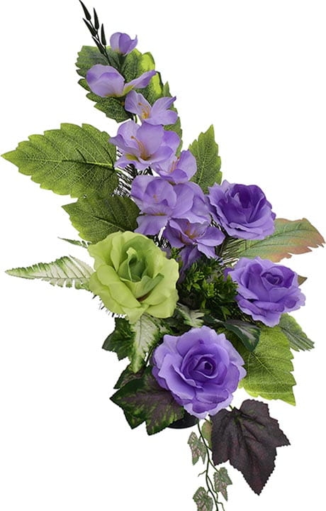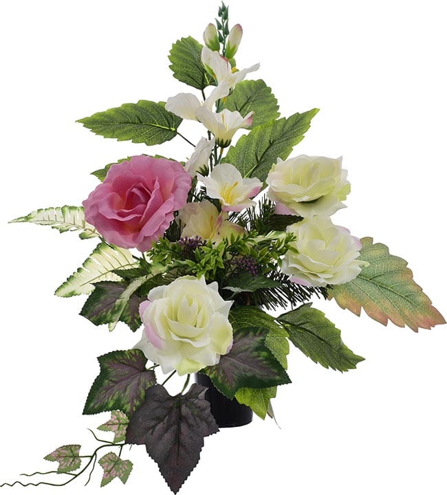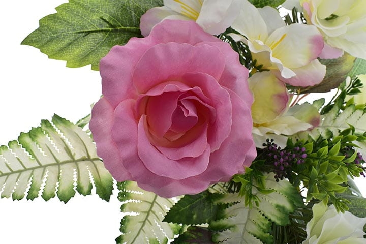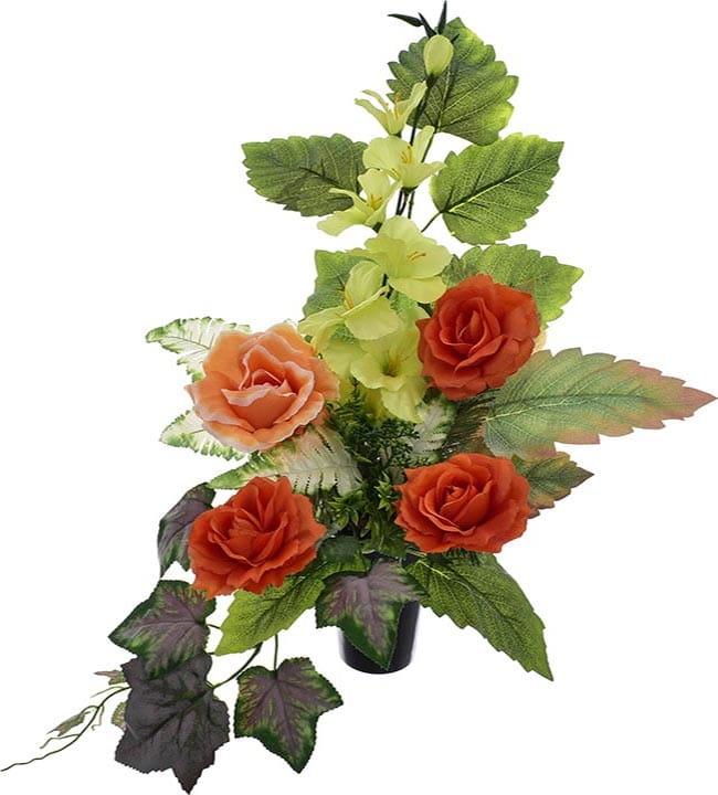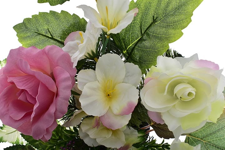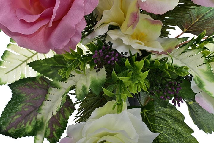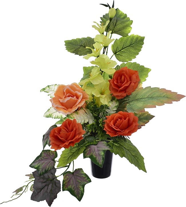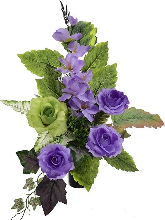 Nasza kompozycja kwiatowa wykonana została z wysokiej jakości sztucznych kwiatów, które są starannie ułożone w obciążonej donicy, dzięki czemu idealnie nadaje się do umieszczenia na grobie.