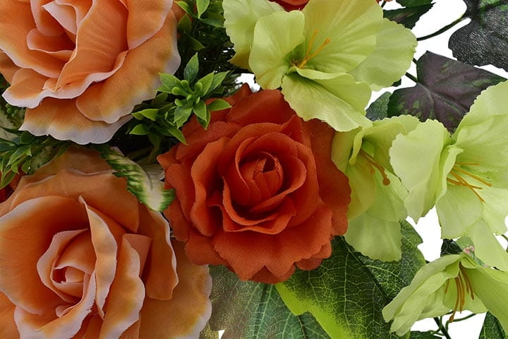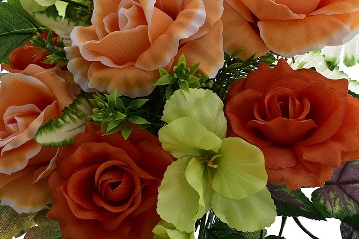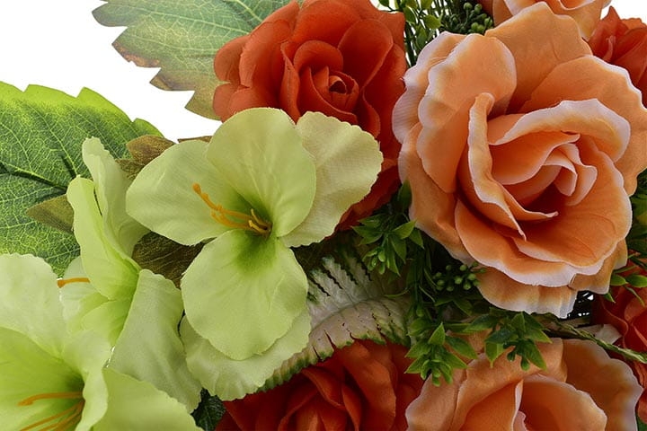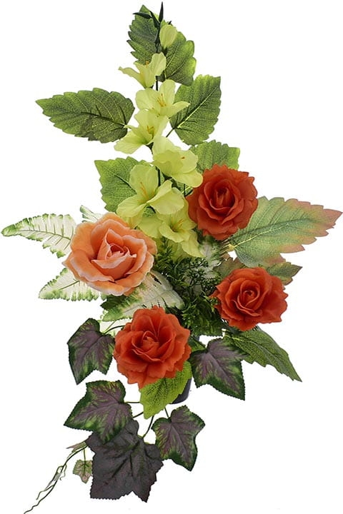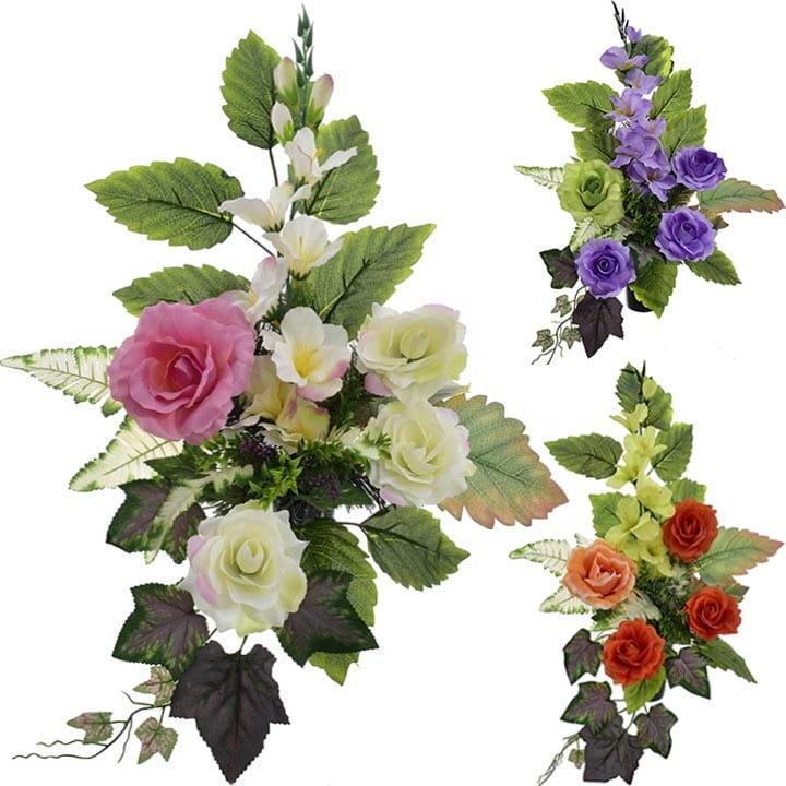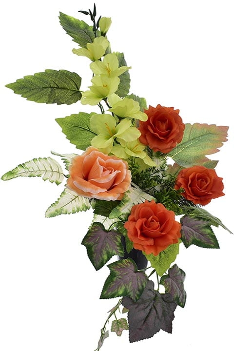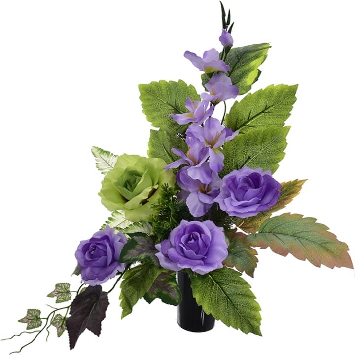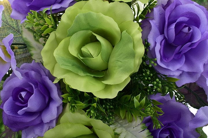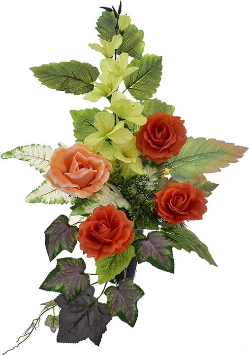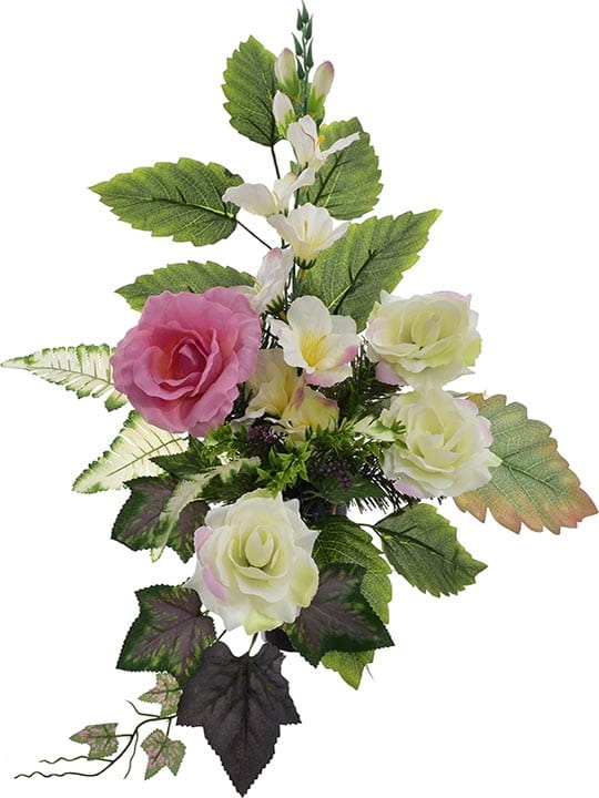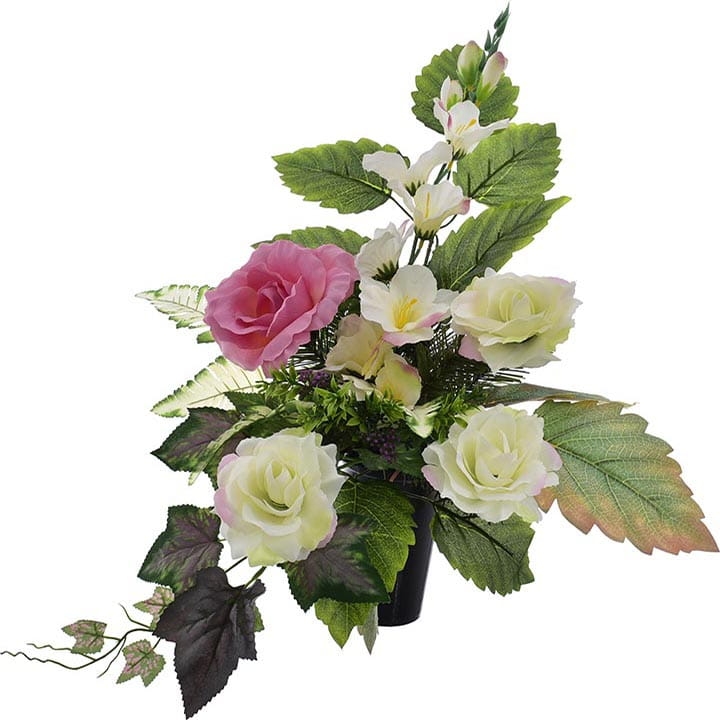 Nasza kompozycja kwiatowa wykonana została z wysokiej jakości sztucznych kwiatów, które są starannie ułożone w obciążonej donicy, dzięki czemu idealnie nadaje się do umieszczenia na grobie.