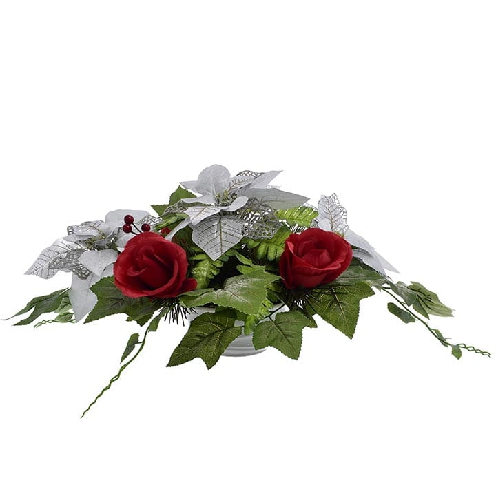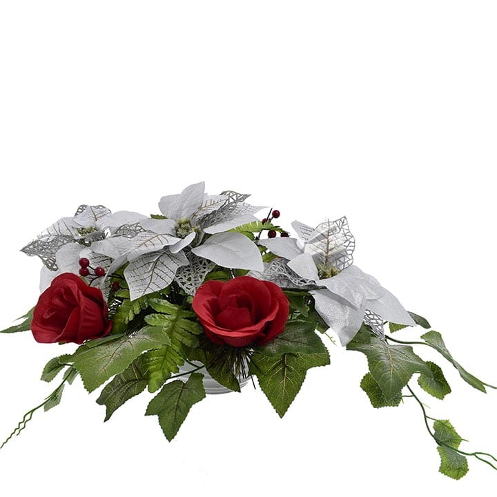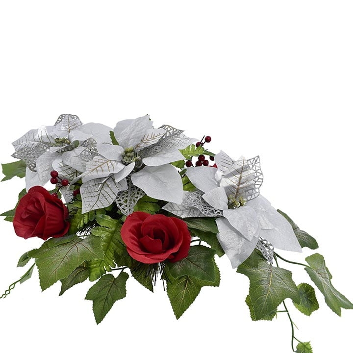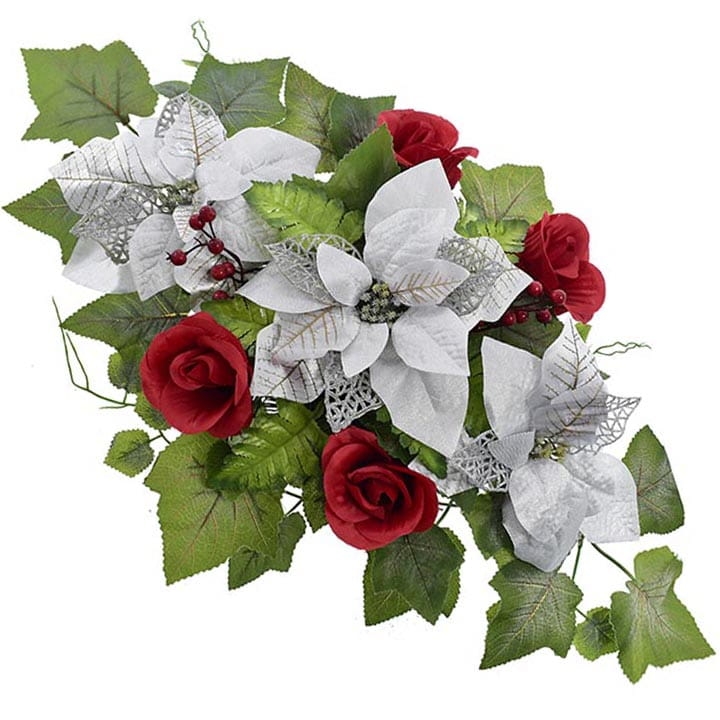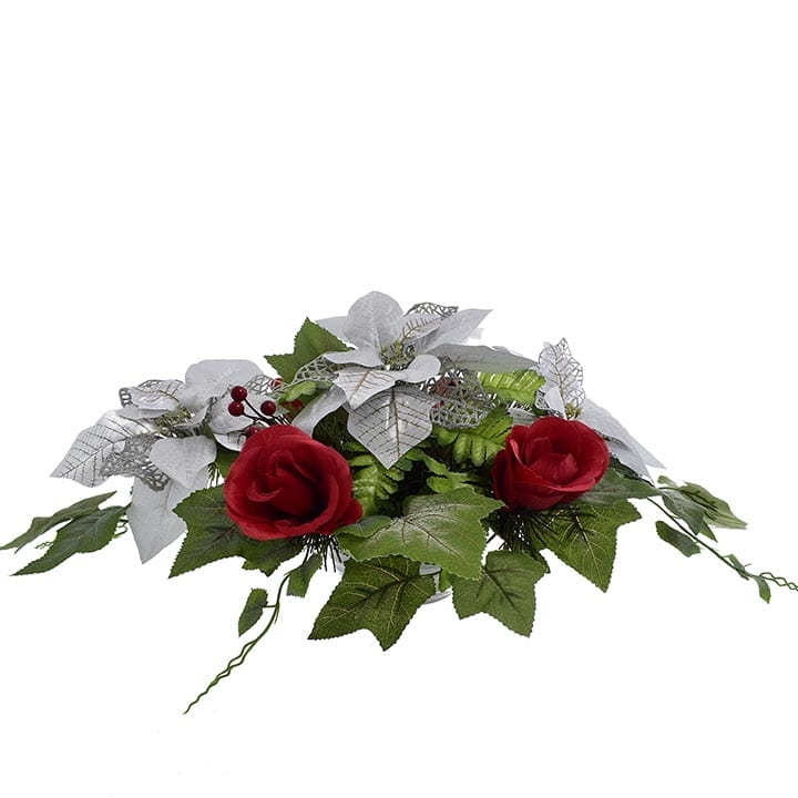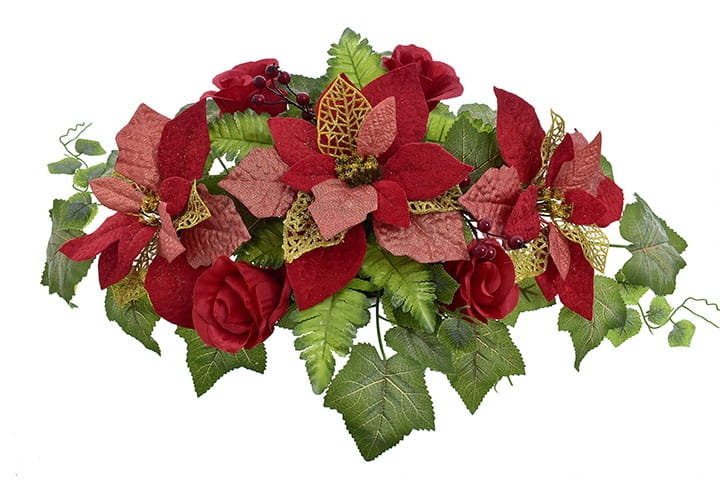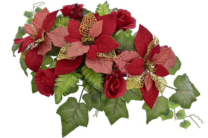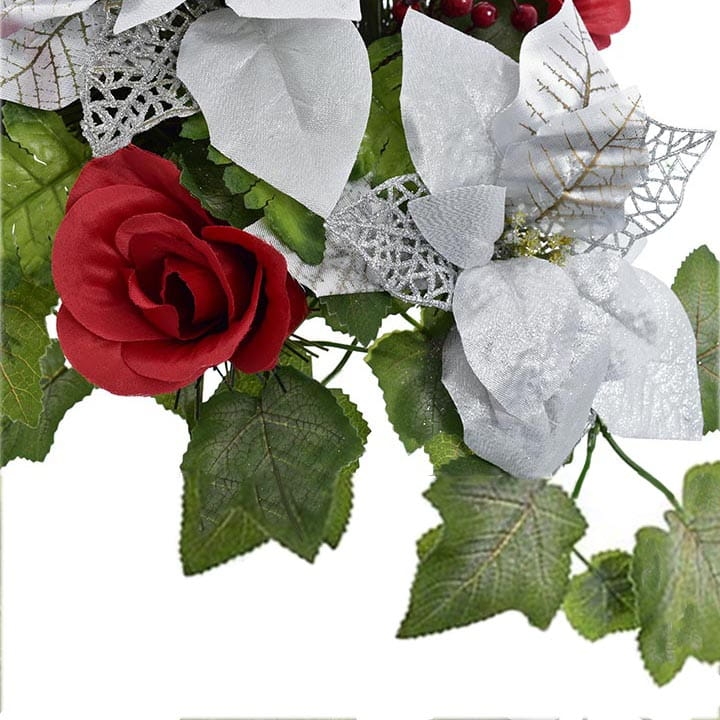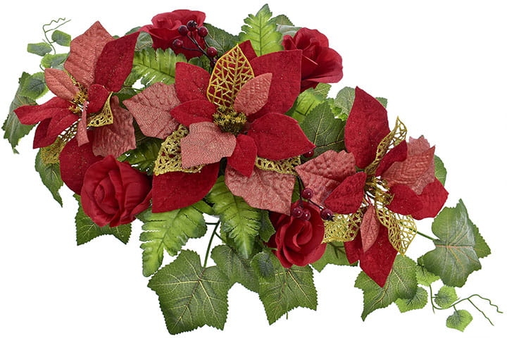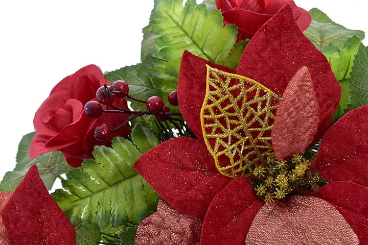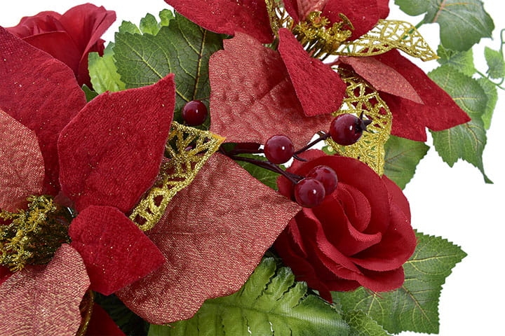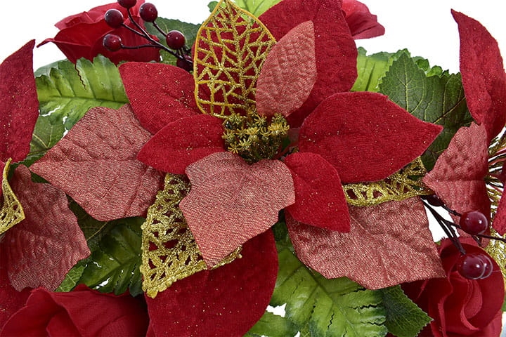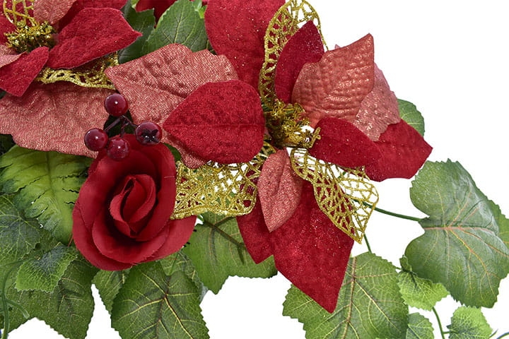 Do przygotowania kompozycji użyte zostały kwiaty gwiazdy betlejemskiej, owoce głogu, oraz inne ozdoby.