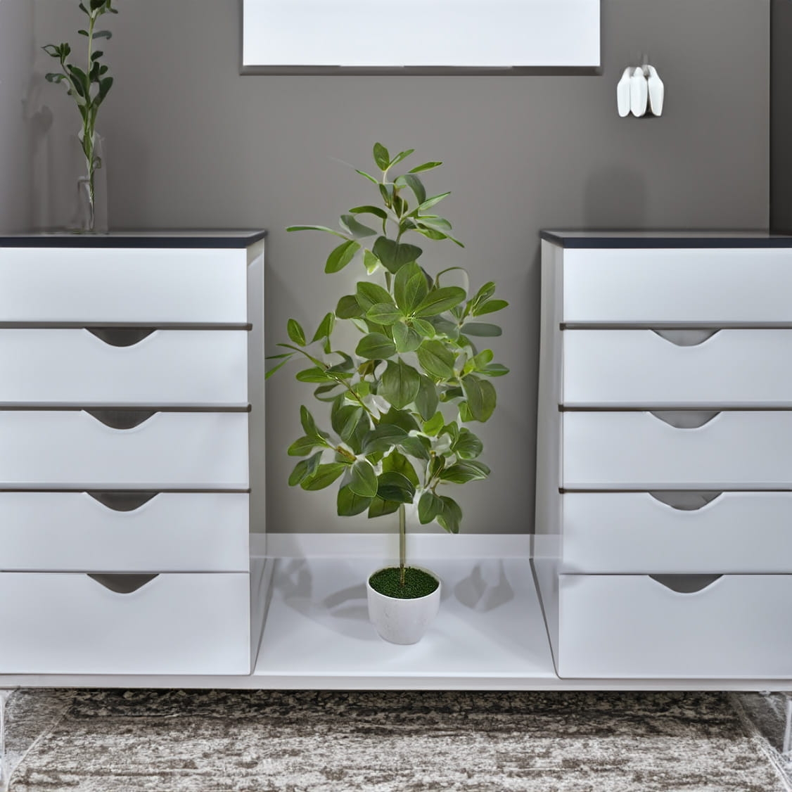 Drzewko umieszczone jest w białej doniczce obciążonej betonem i wyłożonej ozdobną trawą.