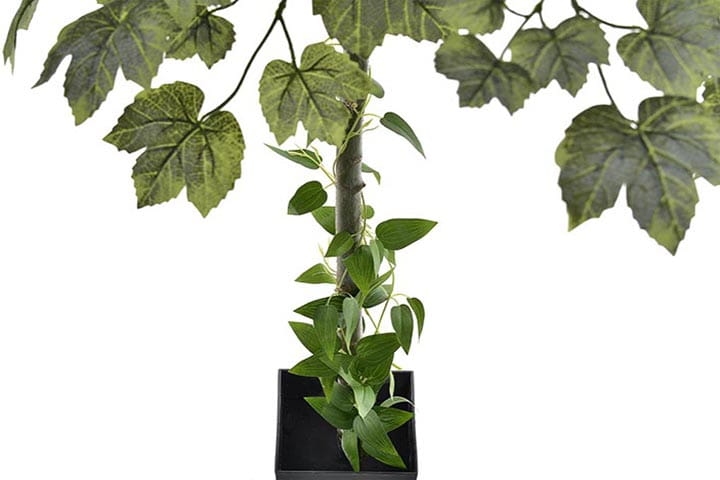 Kompozycja z liści winogron jest obsadzona w solidnej donicy, obciążonej betonem dla większej stabilności, co czyni je idealnym wyborem zarówno do wnętrz, jak i na zewnątrz.