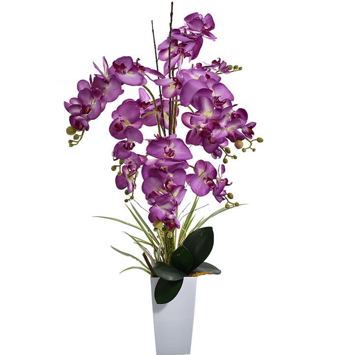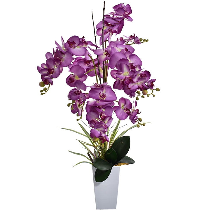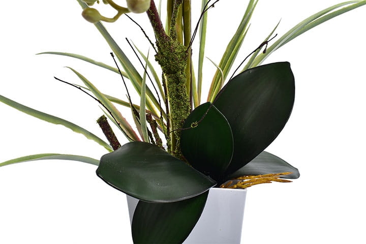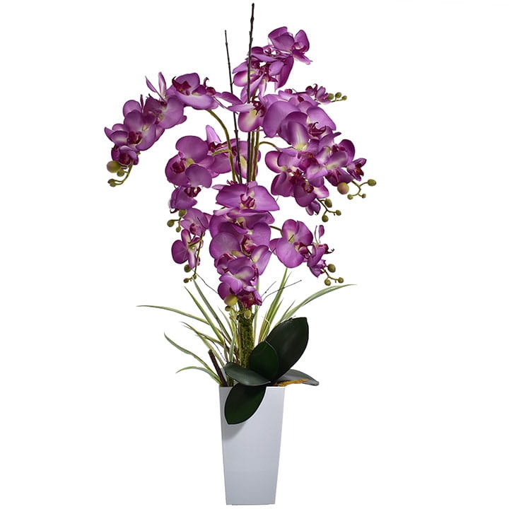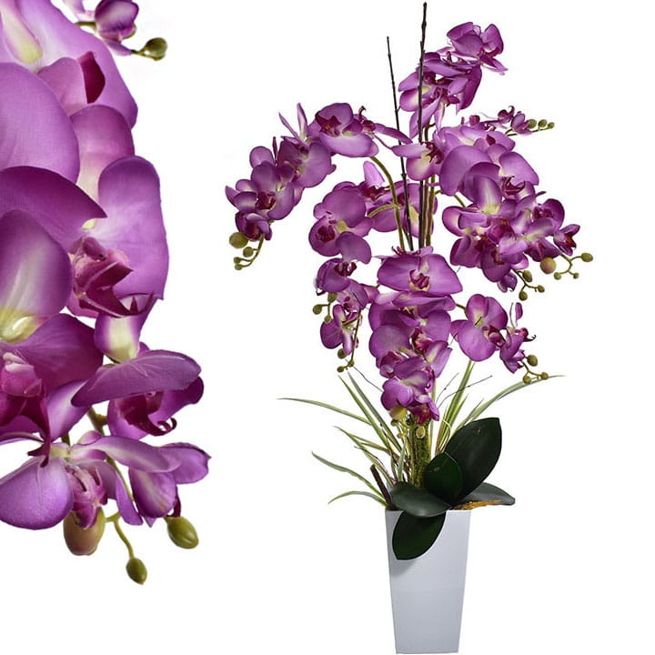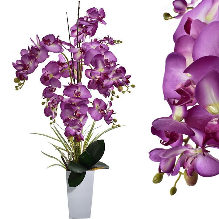 Przedstawiamy naszą oszałamiającą sztuczną orchideę XL w białej donicy.