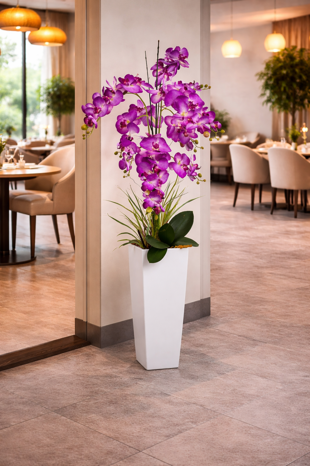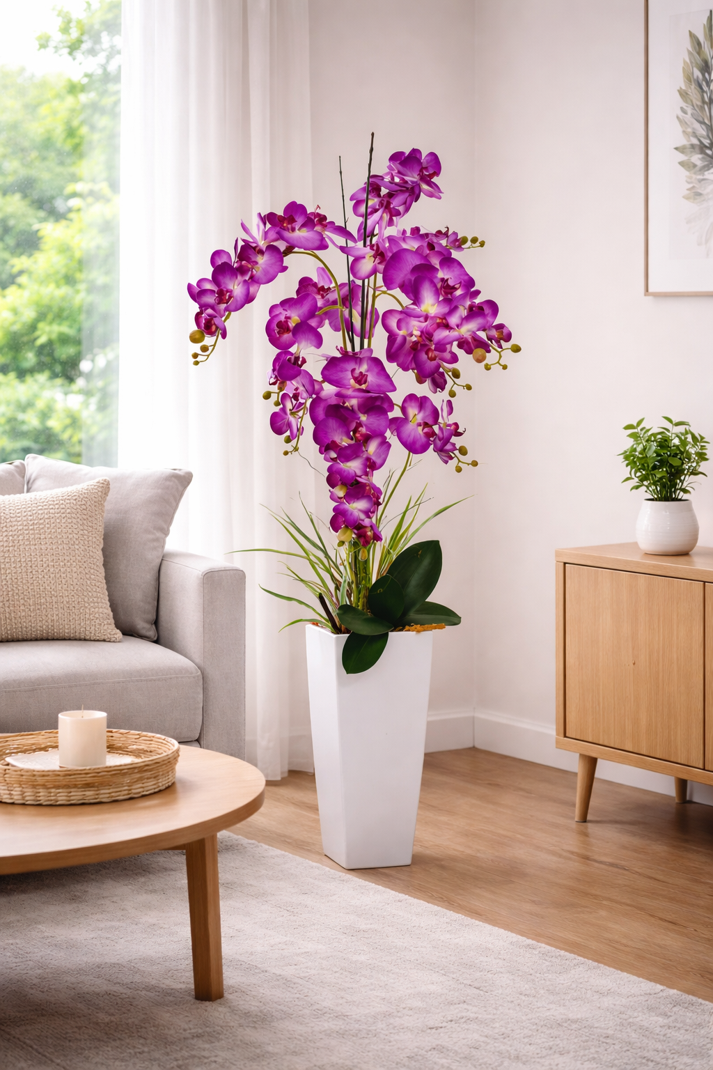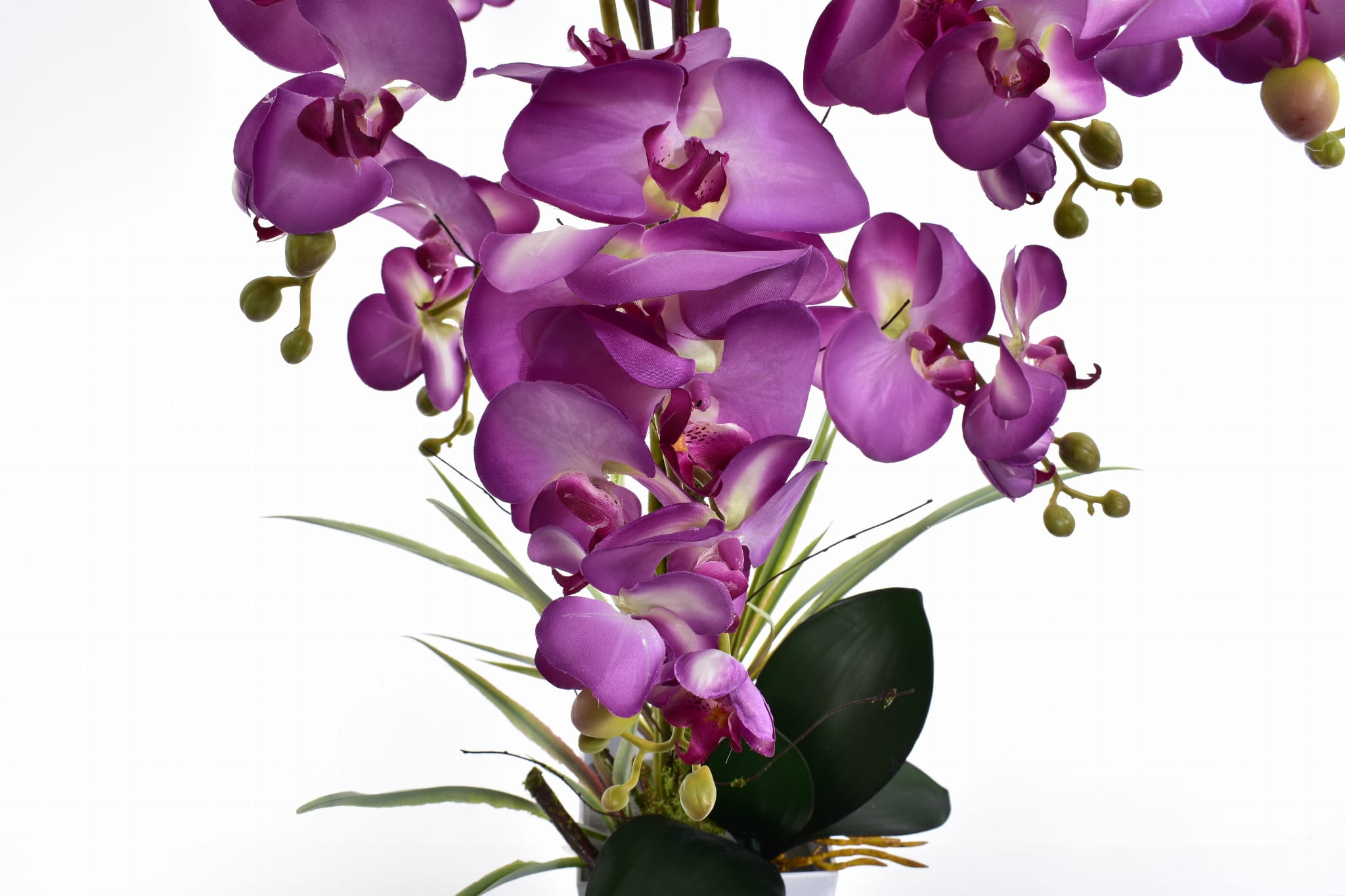 Przedstawiamy naszą oszałamiającą sztuczną orchideę XL w białej donicy.