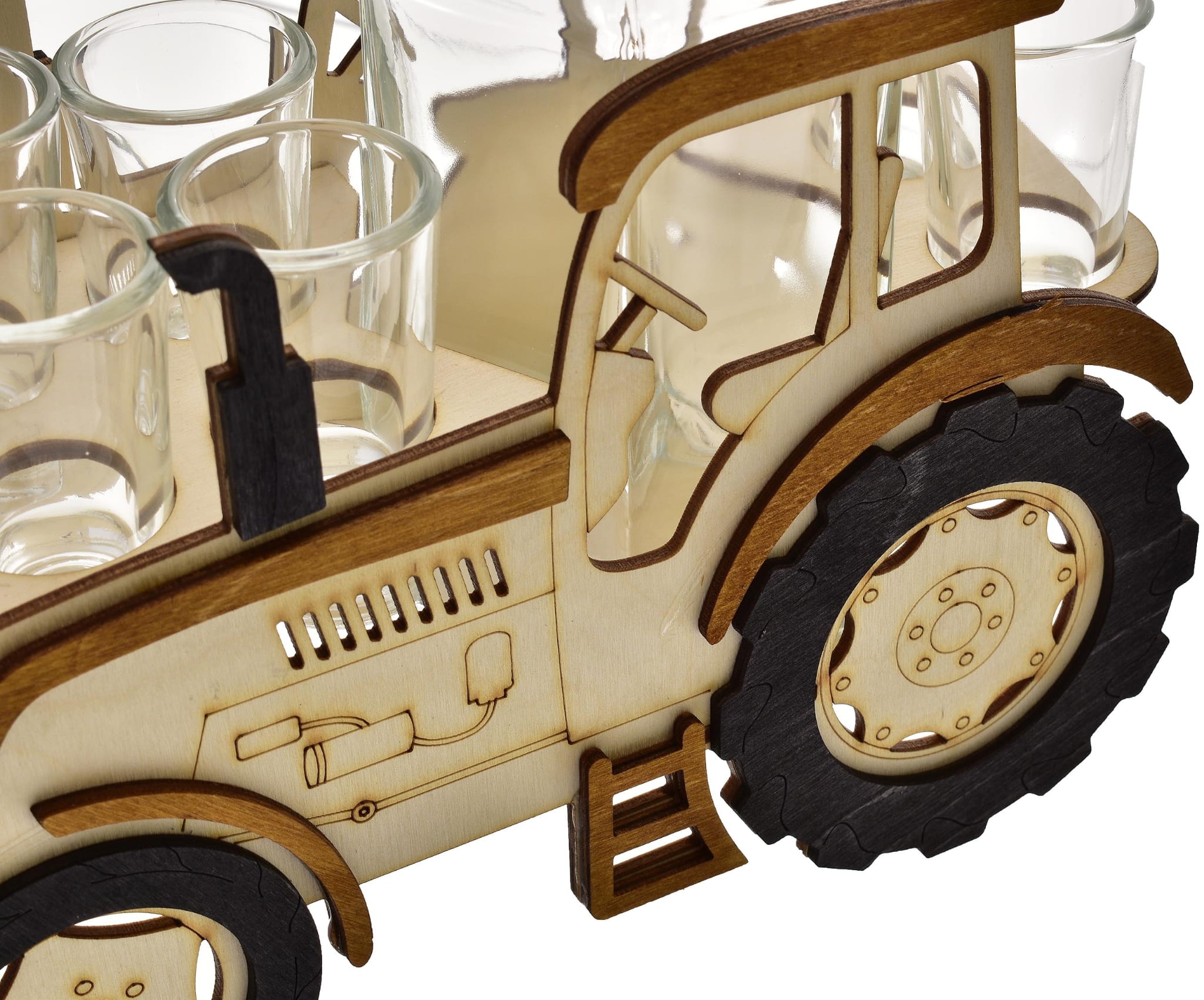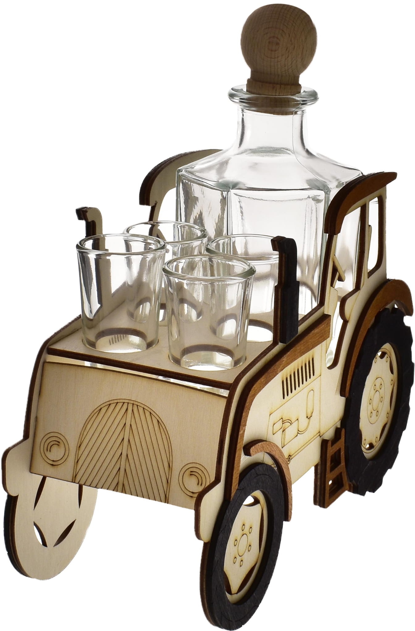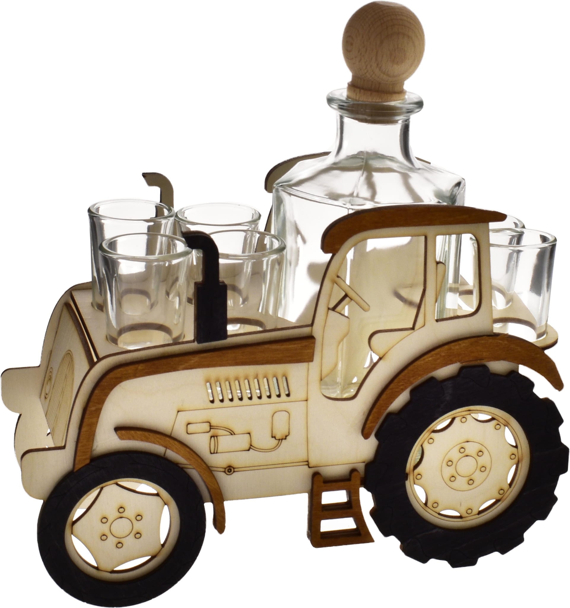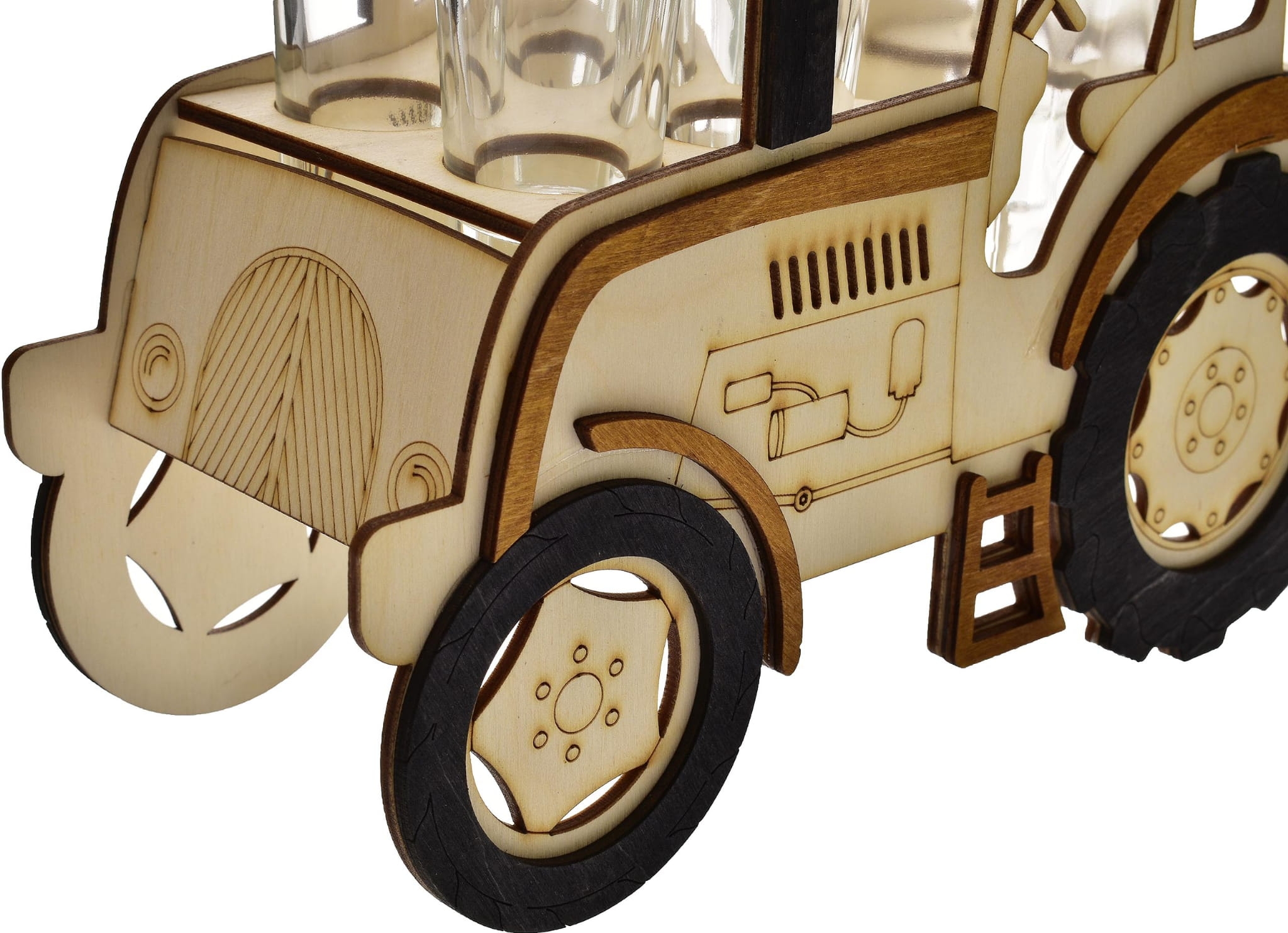 Drewniane wykonanie w kształcie traktora, pojemność karafki 500 ml.
