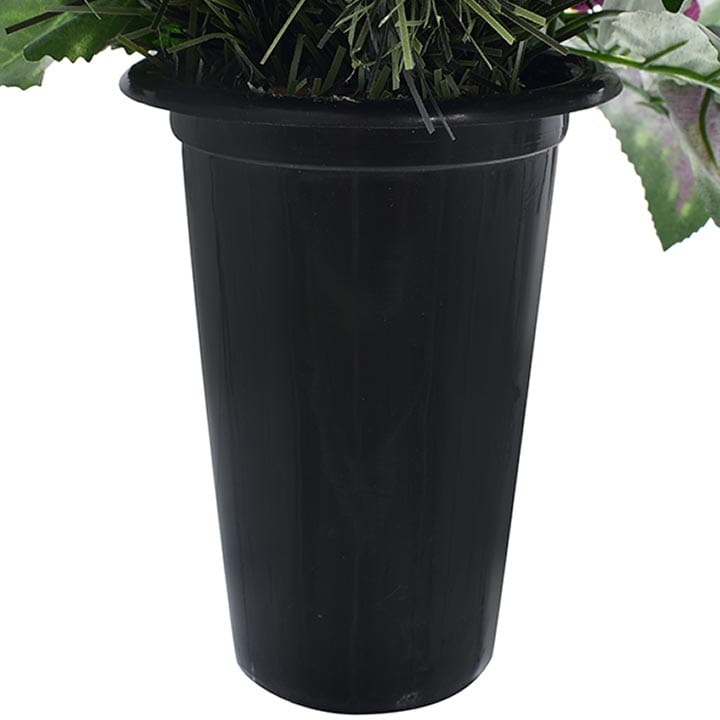 Obciążona donica kompozycji jest stabilna, nie przesuwa się i nie przewraca na grobie.
