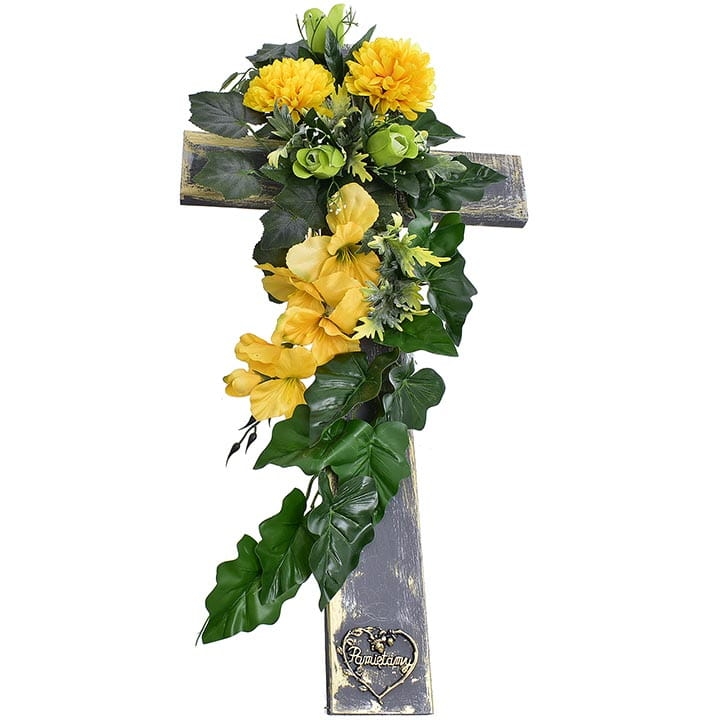 Kompozycja umieszczona na pięknym, drewnianym krzyżu, dzięki czemu nadaje się na grób ukochanej osoby.