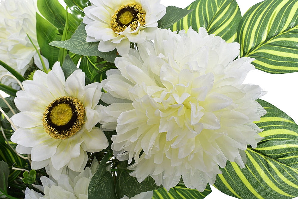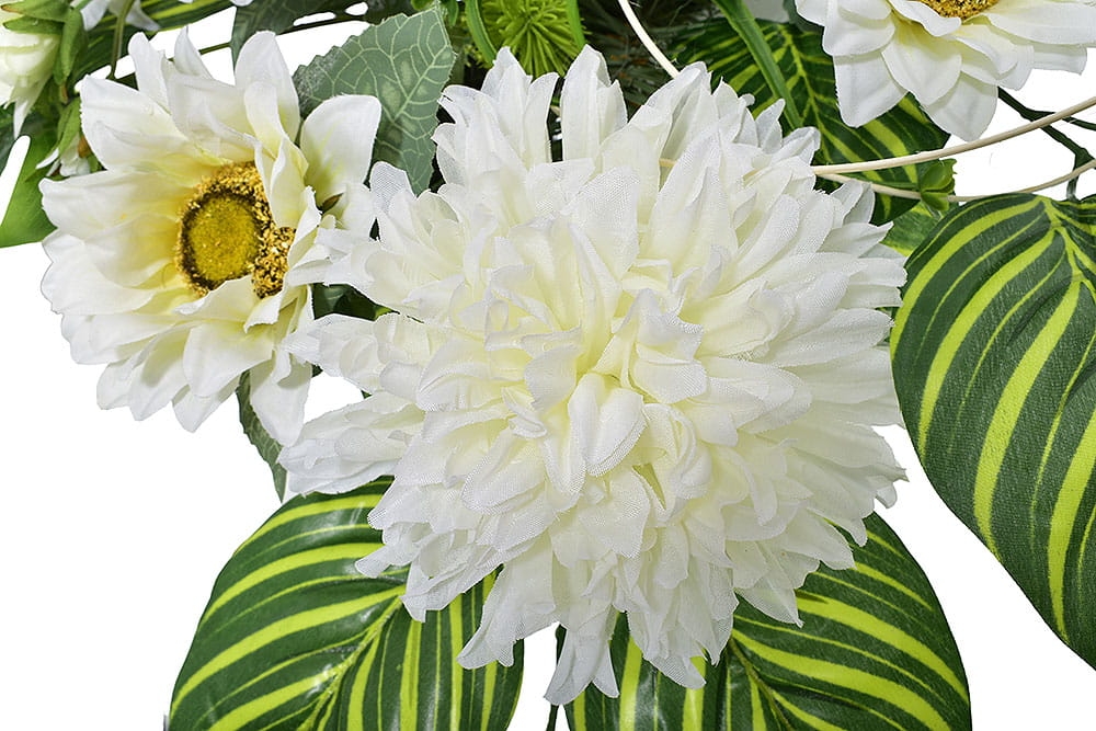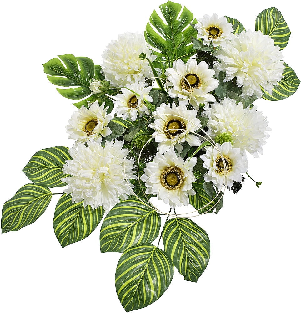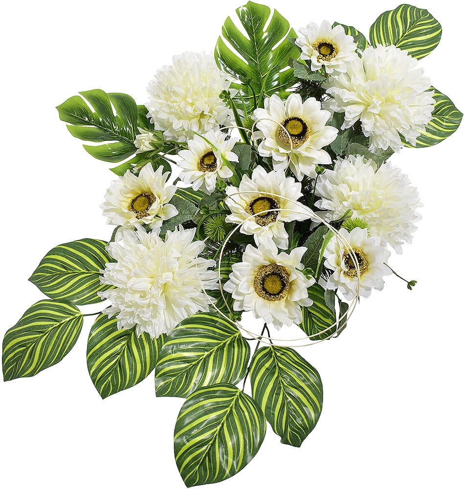 KOMPOZYCJA KWIATOWA CHRYZANTEMA SŁONECZNIK LIŚCIE STROIK NAGROBNY SZTUCZNE KWIATY