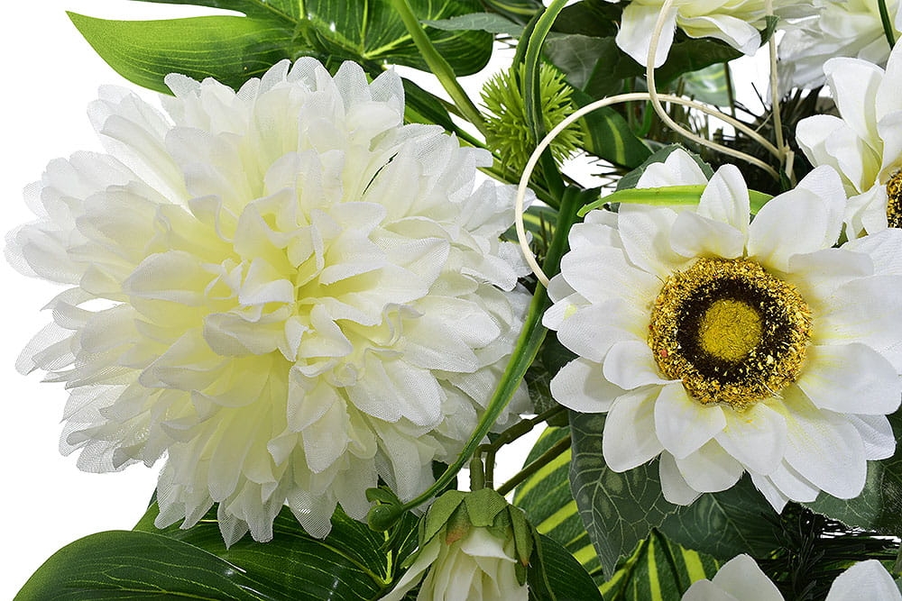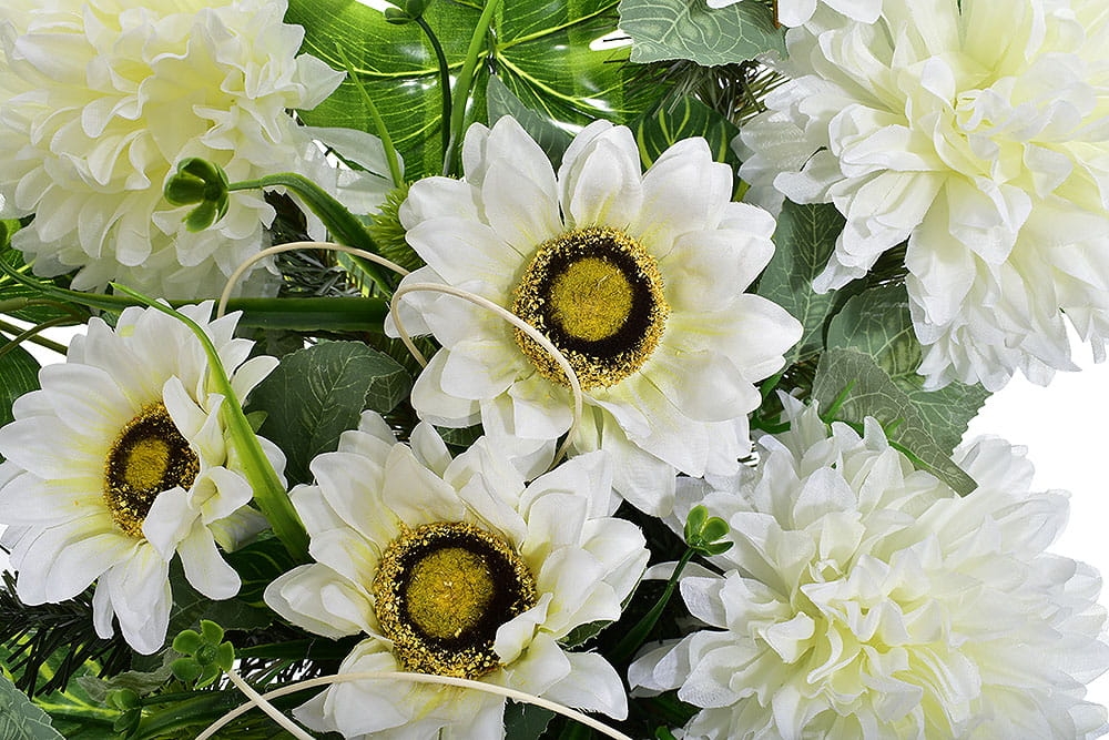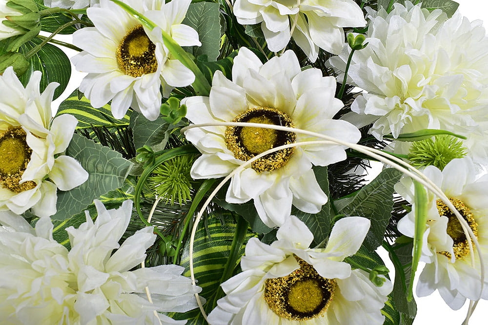 Przedstawiamy przepiękną kompozycję nagrobną wykonaną z wysokiej jakości sztucznych kwiatów.