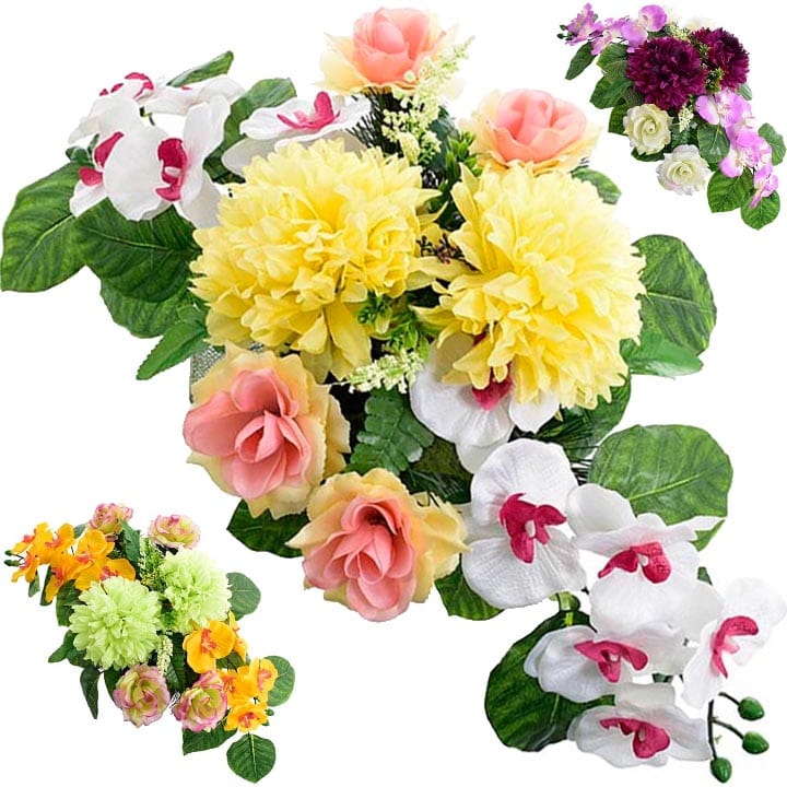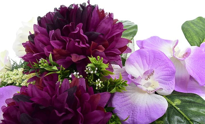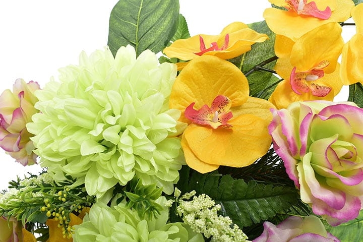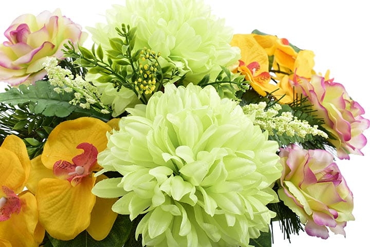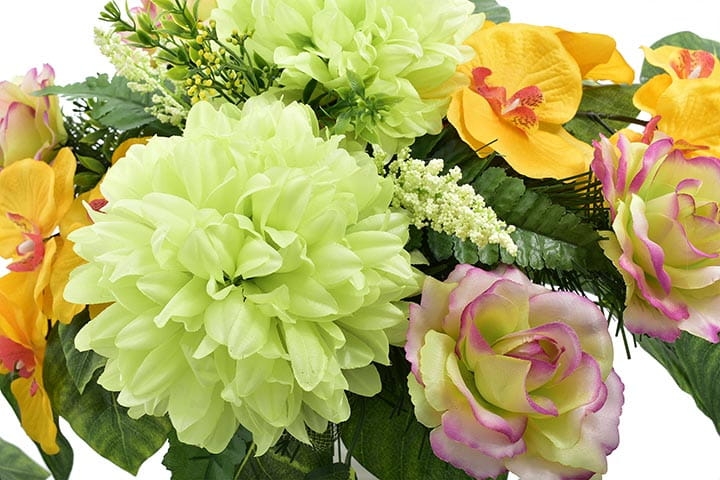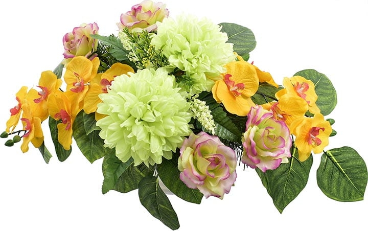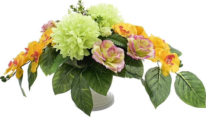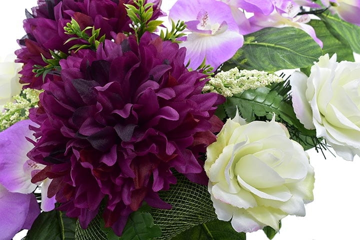 Różnorodne kwiaty umieszczone w kompozycji sprawią, że będzie ona ładnie prezentować się o każdej porze roku.