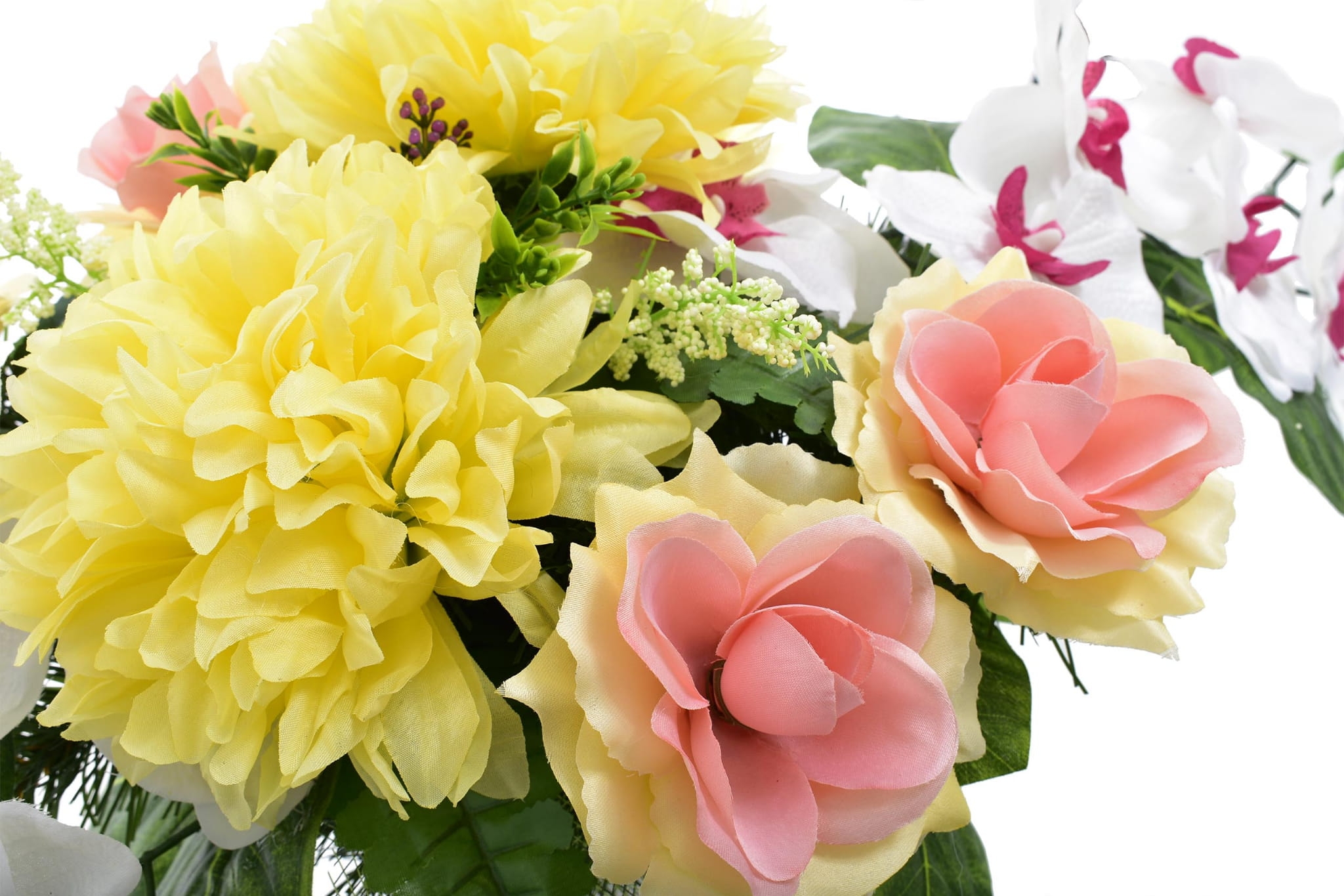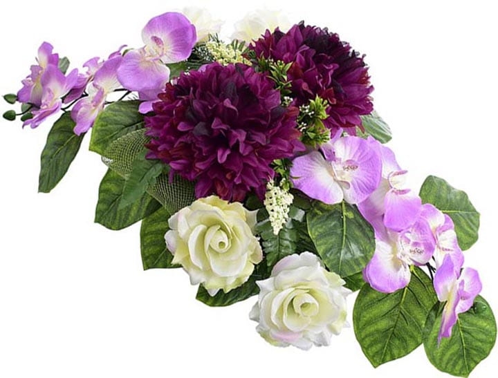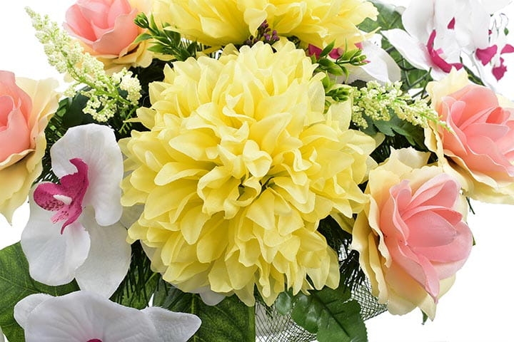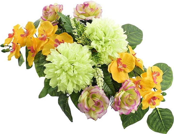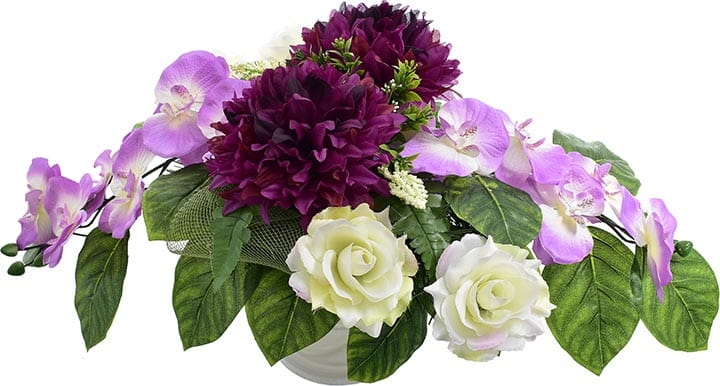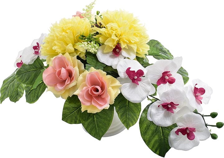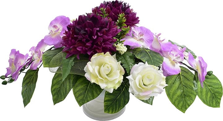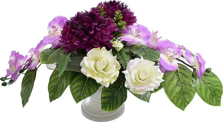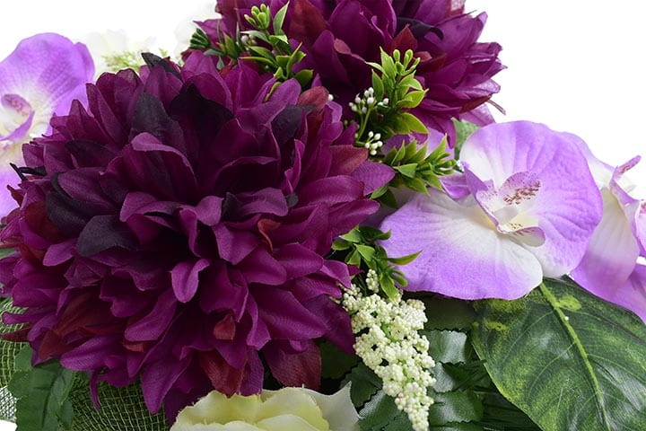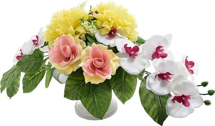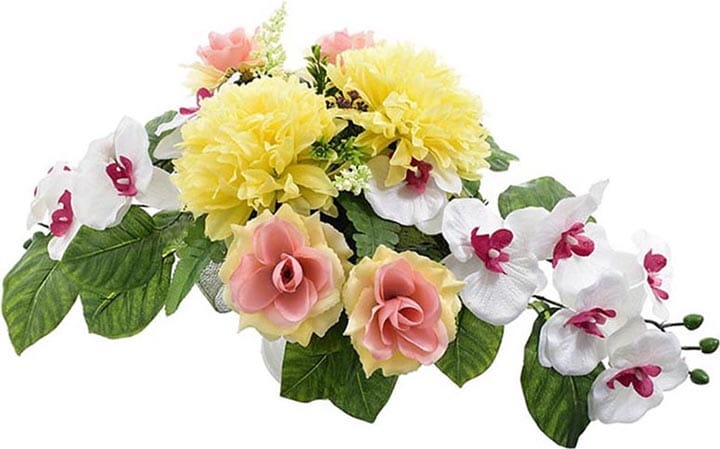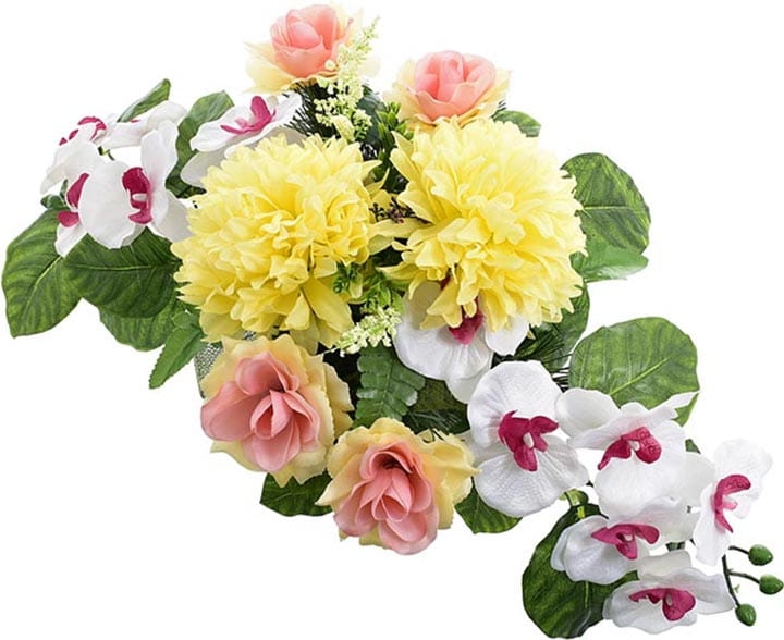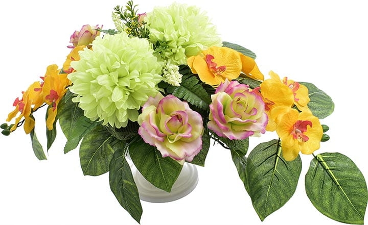 Całoroczna kompozycja wykonana ręcznie z dużą starannością z wysokiej jakości kwiatów, co sprawia, że wygląda bardzo naturalnie.