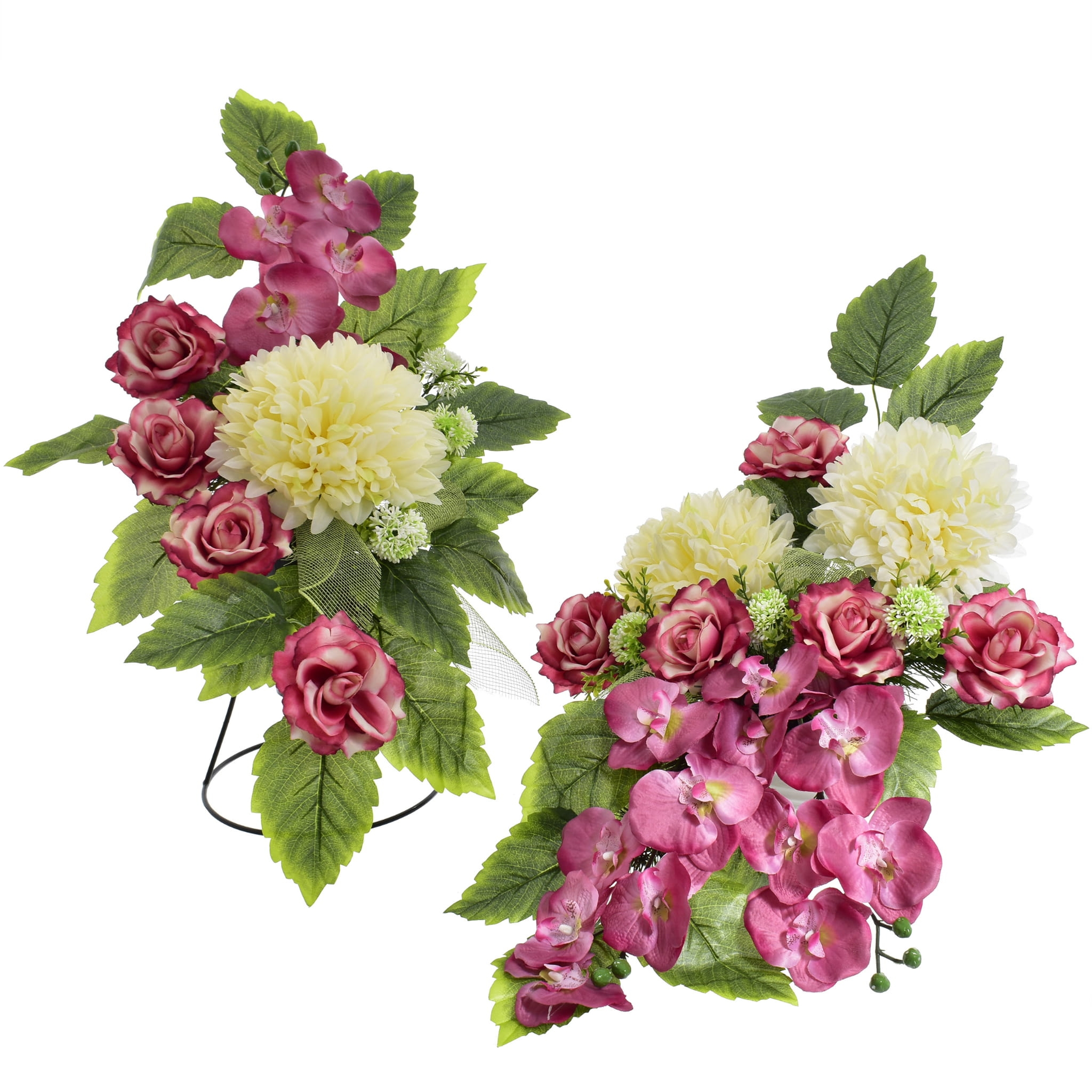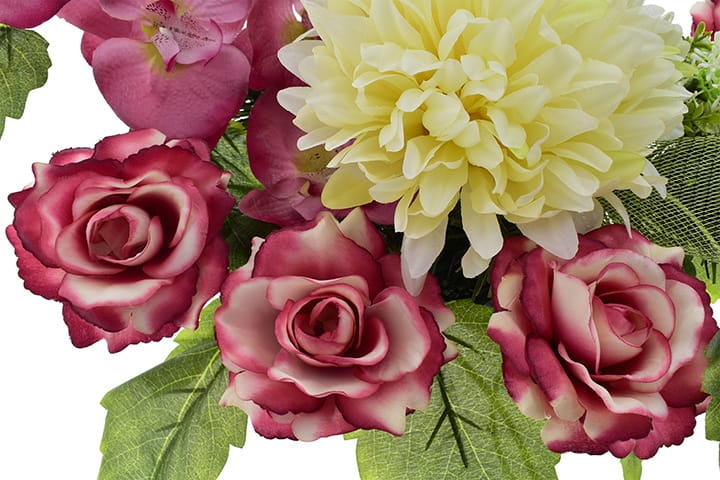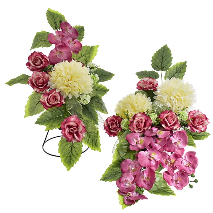 Dekoracje wykonane z najwyższej jakości sztucznych kwiatów, które zostały starannie ułożone w obciążonych doniczkach, co pozwala na bezpieczne umieszczenie ich na grobie.