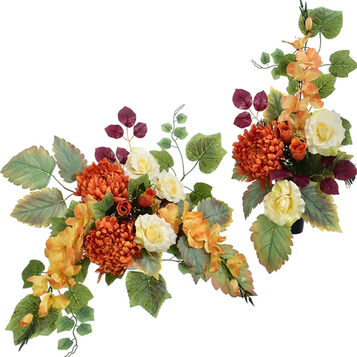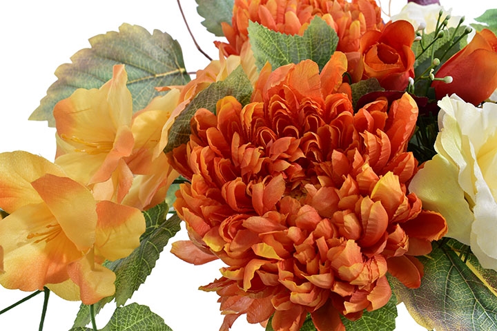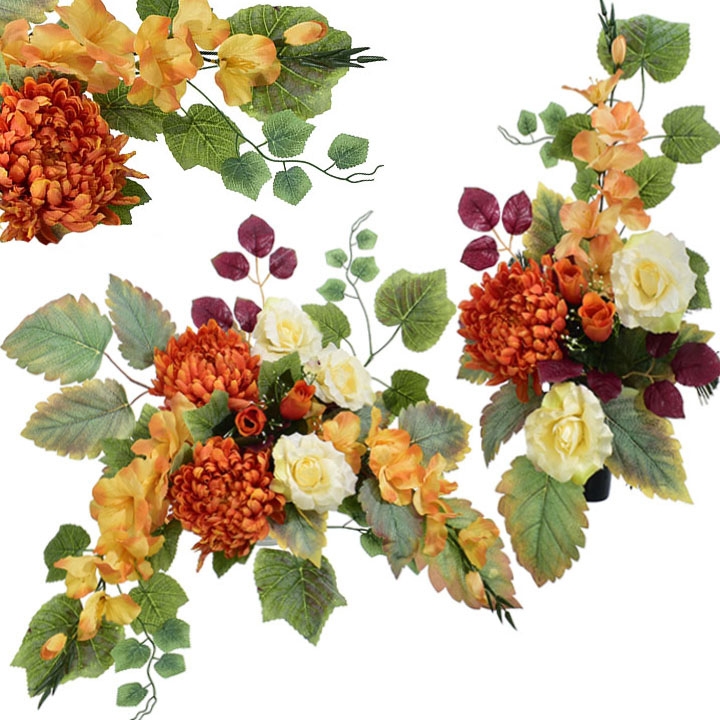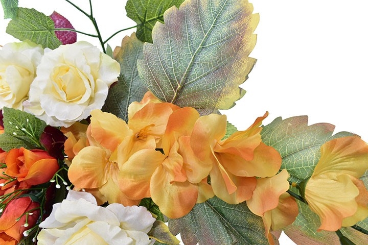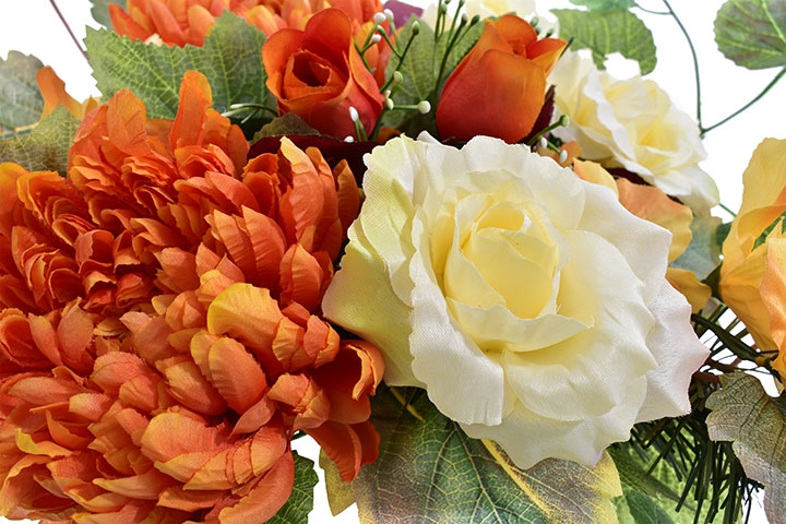 Starannie dobrane sztuczne kwiaty w ciepłych odcieniach pomarańczu i kremu, uzupełnione dekoracyjnymi liśćmi, tworzą spójną i harmonijną aranżację, która pięknie prezentuje się na miejscu pamięci.