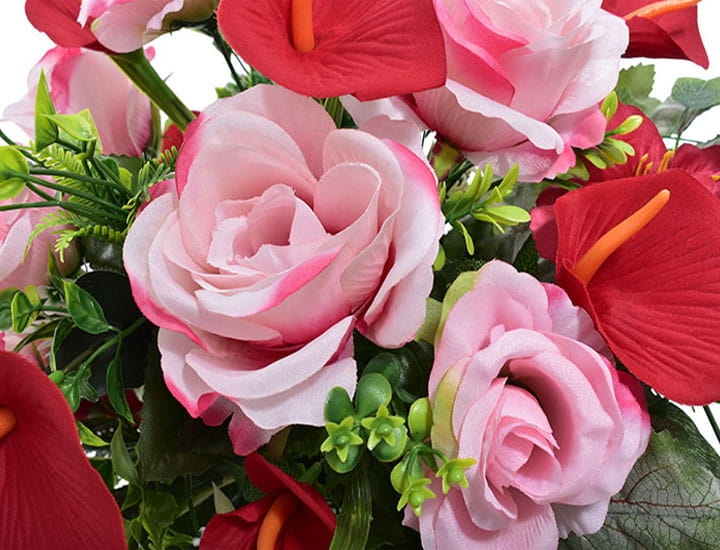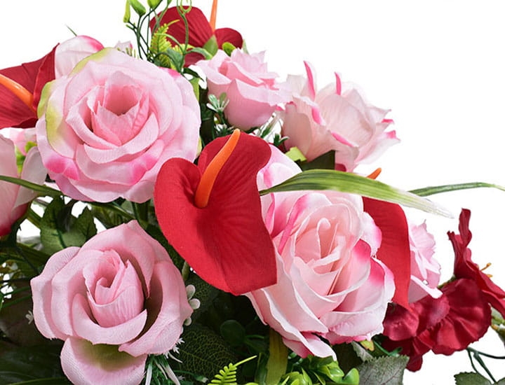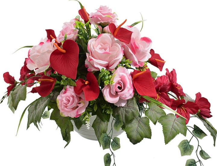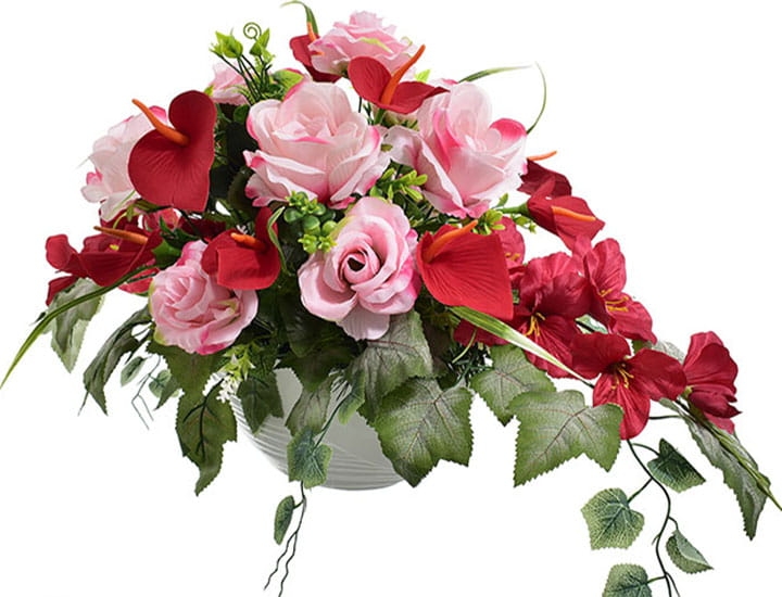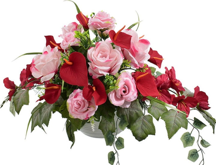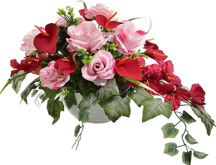 KOMPOZYCJA KWIATOWA RÓŻA MIECZYK ANTURIUM GAŁĄZKI LIŚCIE WIĄZANKA NAGROBNA STROIK SZTUCZNE KWIATY