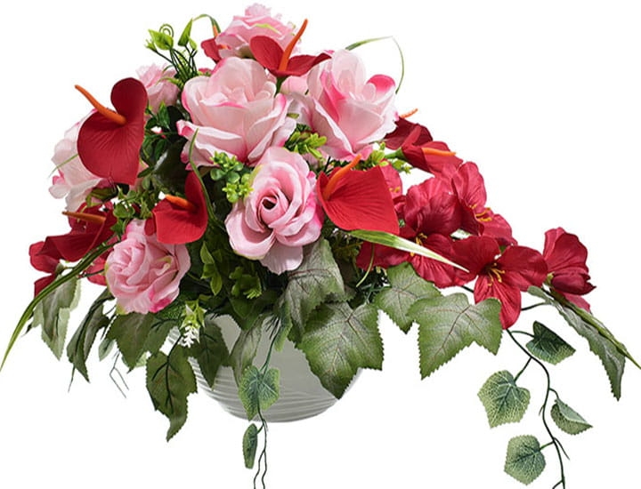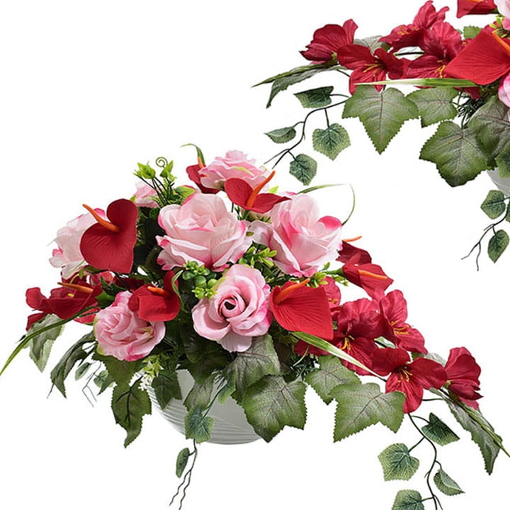 Piękna kompozycja ze sztucznych kwiatów stroik na cmentarz w donicy