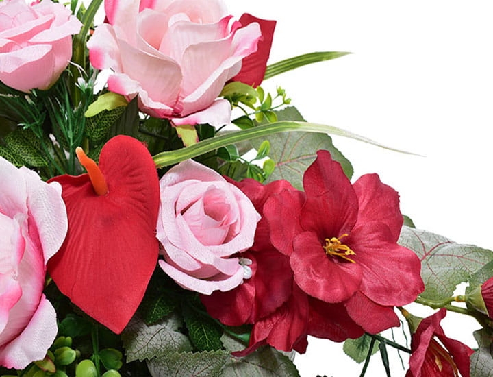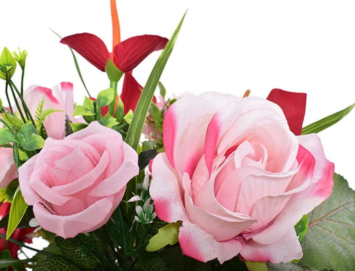 Przedstawiamy przepiękną kompozycję nagrobną wykonaną z wysokiej jakości sztucznych kwiatów.