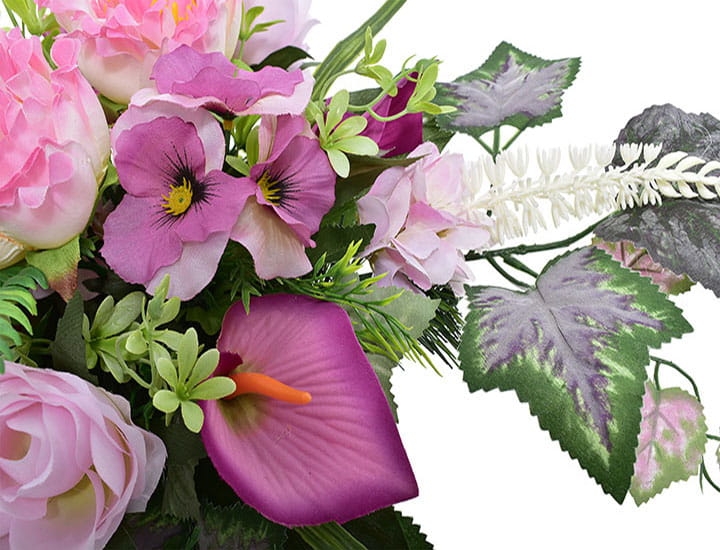 KOMPOZYCJA KWIATOWA RÓŻA PEONIA BRATKI ANTURIUM GAŁĄZKI DEKORACYJNE ORAZ LIŚCIE WIĄZANKA NAGROBNA STROIK