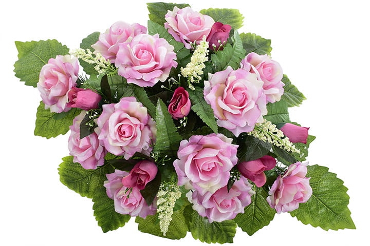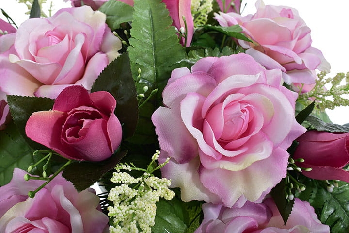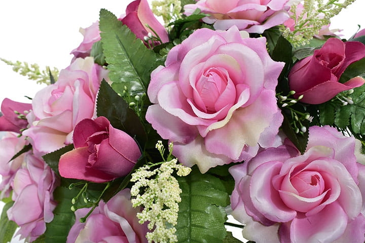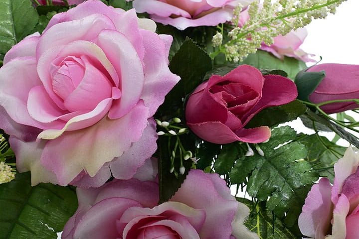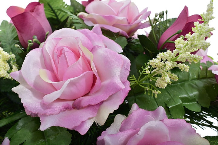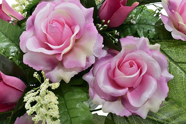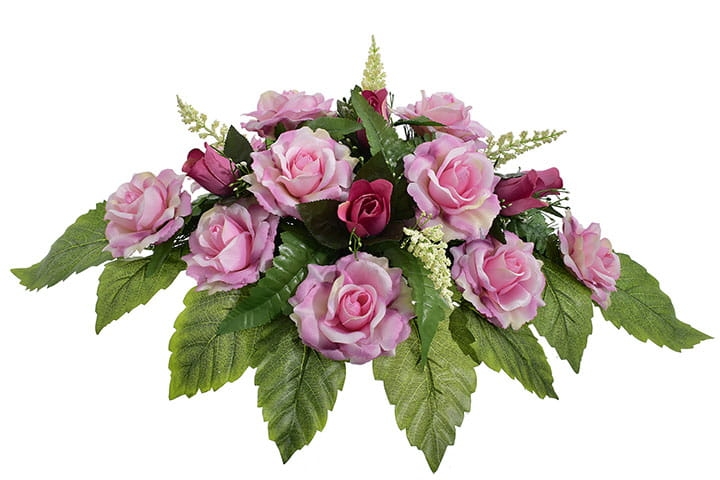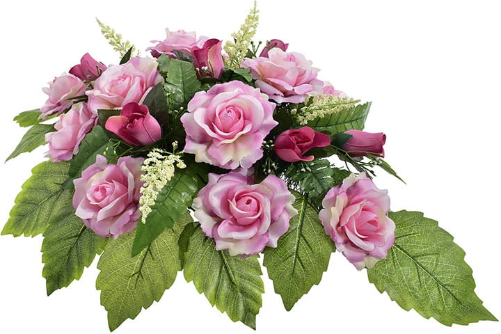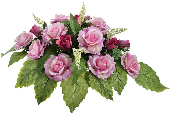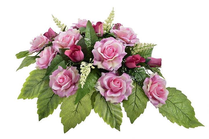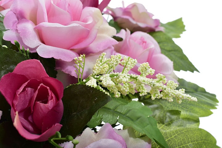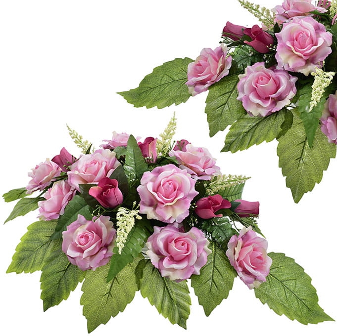 Piękna i trwała kompozycja nagrobna ze sztucznych kwiatów, która stanowi godny sposób na uczczenie pamięci bliskiej osoby. Wykonana ręcznie z wyjątkową starannością oraz dbałością o detale, prezentuje się niezwykle elegancko i naturalnie.