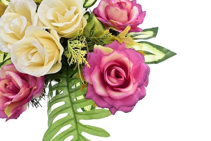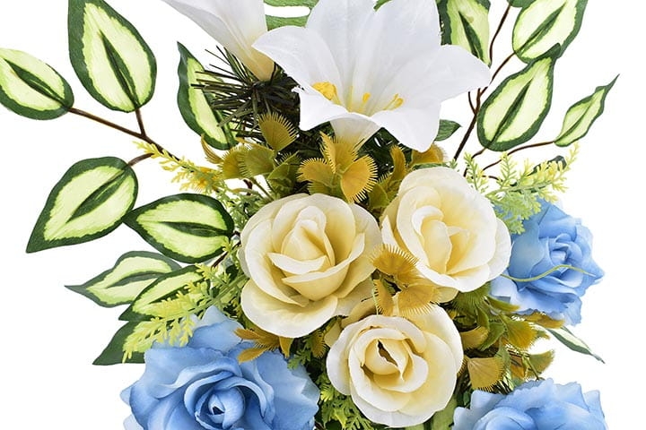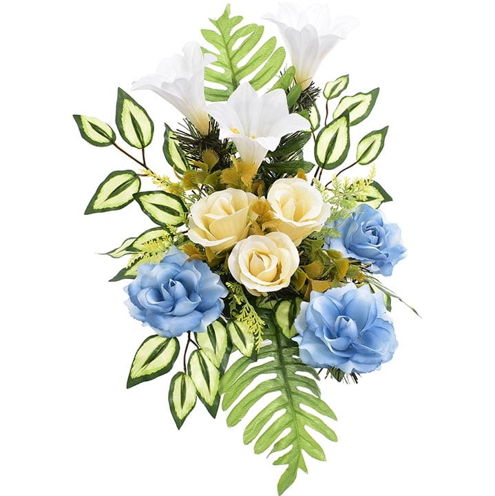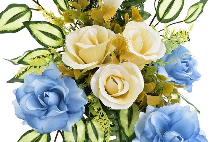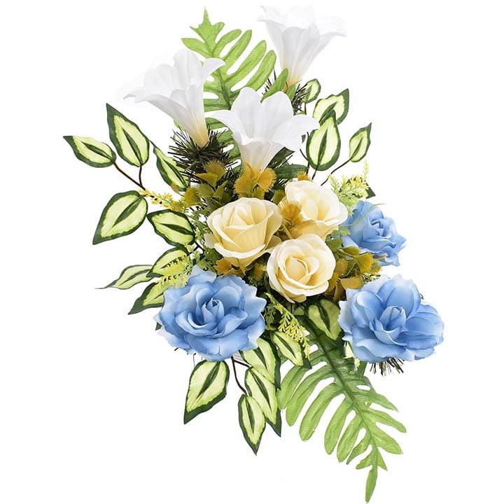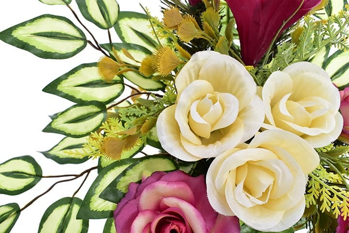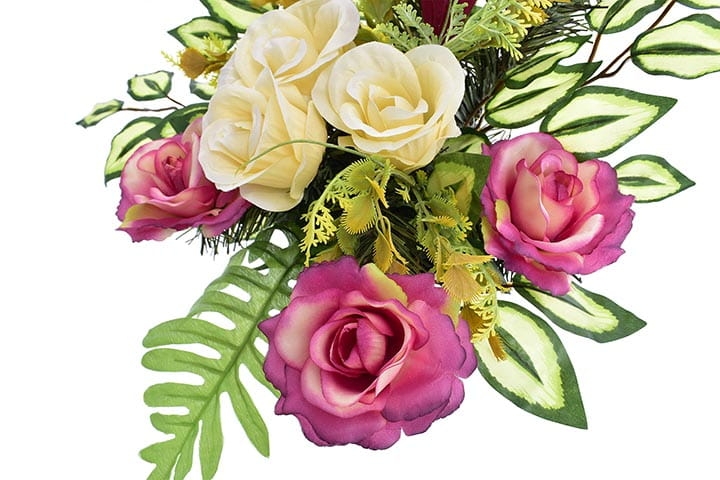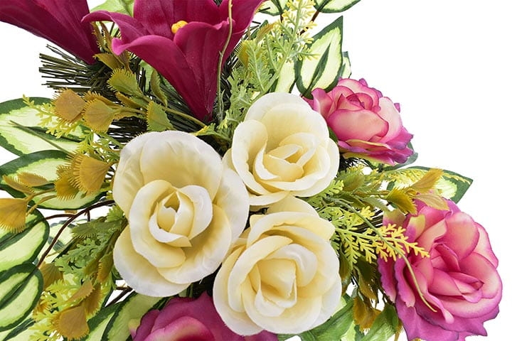 Starannie dobrana kolorystyka sprawia, że stroik będzie się ładnie prezentował zarówno na jasnej jak i ciemnej płycie nagrobnej.