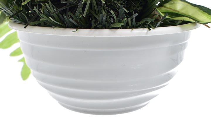 Kompozycja osadzona w okrągłej plastikowej doniczce zalanej betonem.