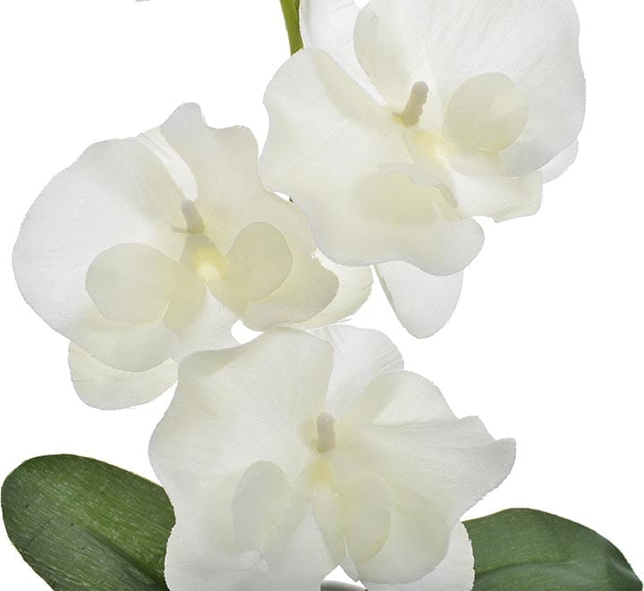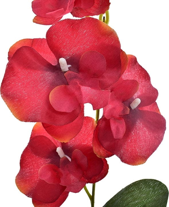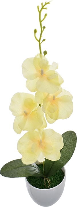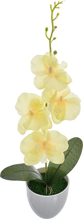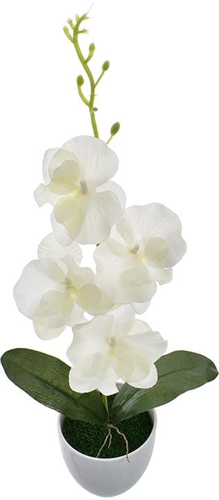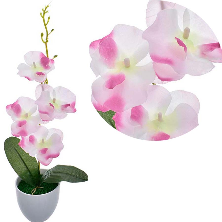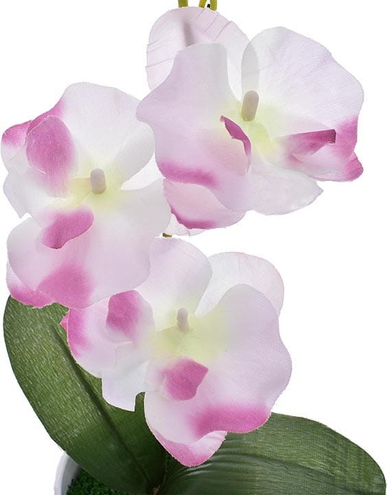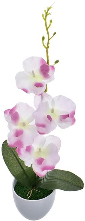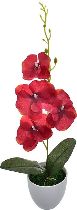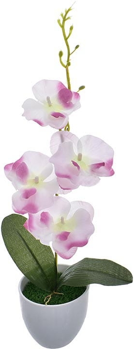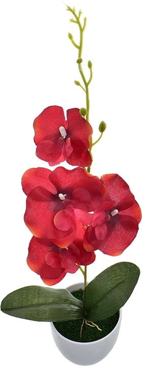 Przepiękna kompozycja kwiatowa wykonana z materiałowych kwiatów storczyka przy zastosowaniu wysokiej jakości materiałów prezentuje się niezwykle realistycznie.