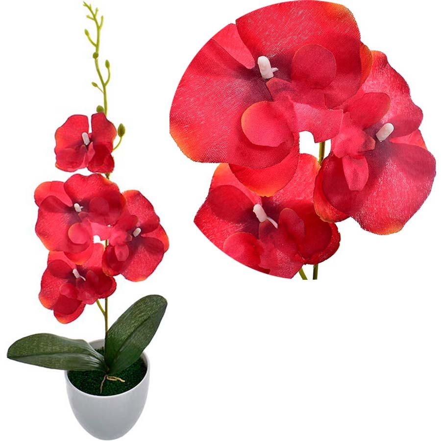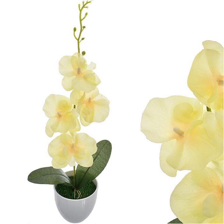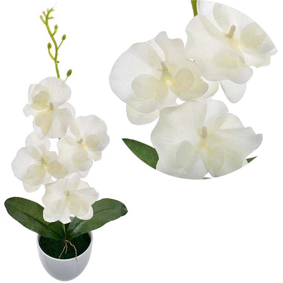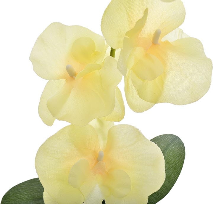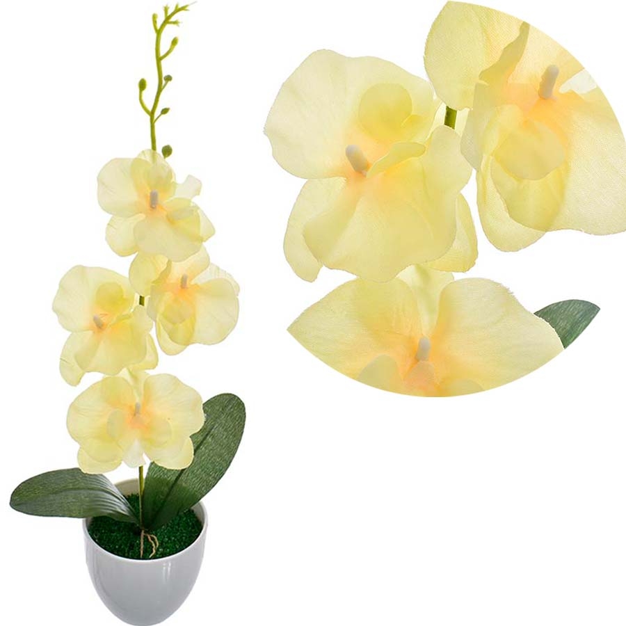 Przepiękna kompozycja kwiatowa wykonana z materiałowych kwiatów storczyka przy zastosowaniu wysokiej jakości materiałów prezentuje się niezwykle realistycznie.