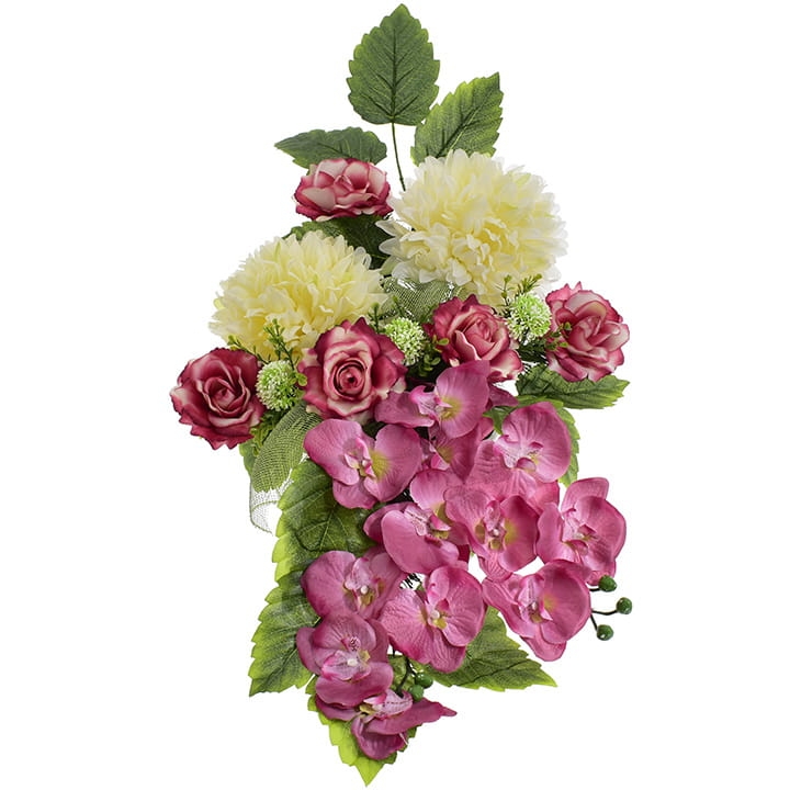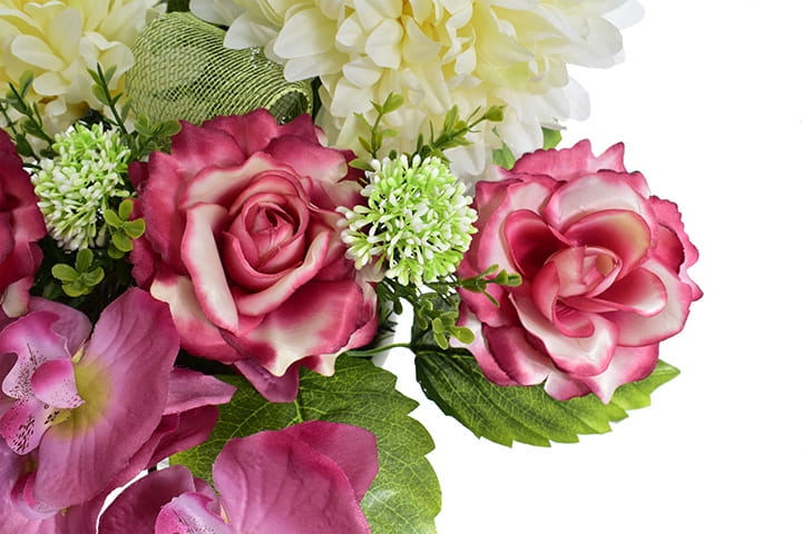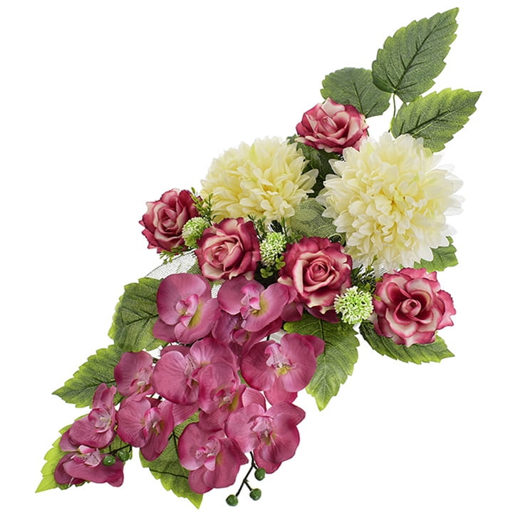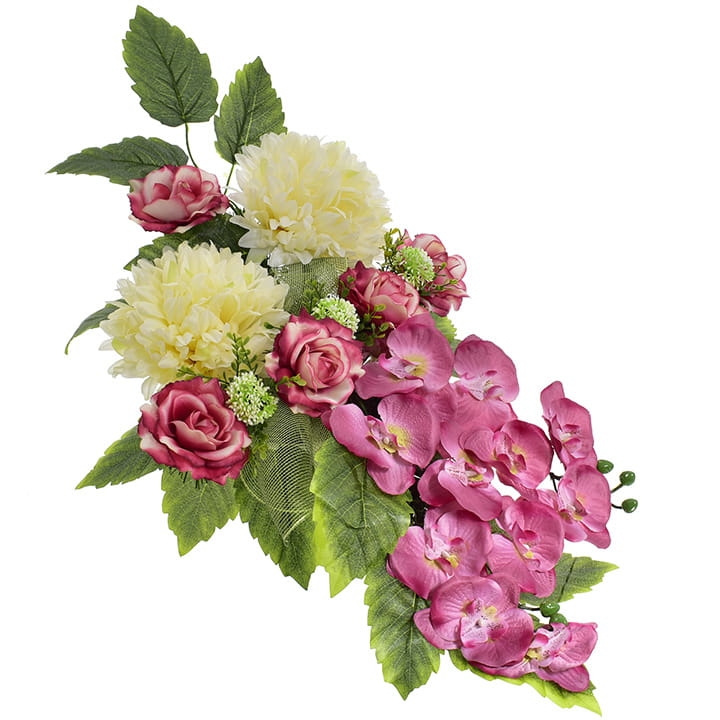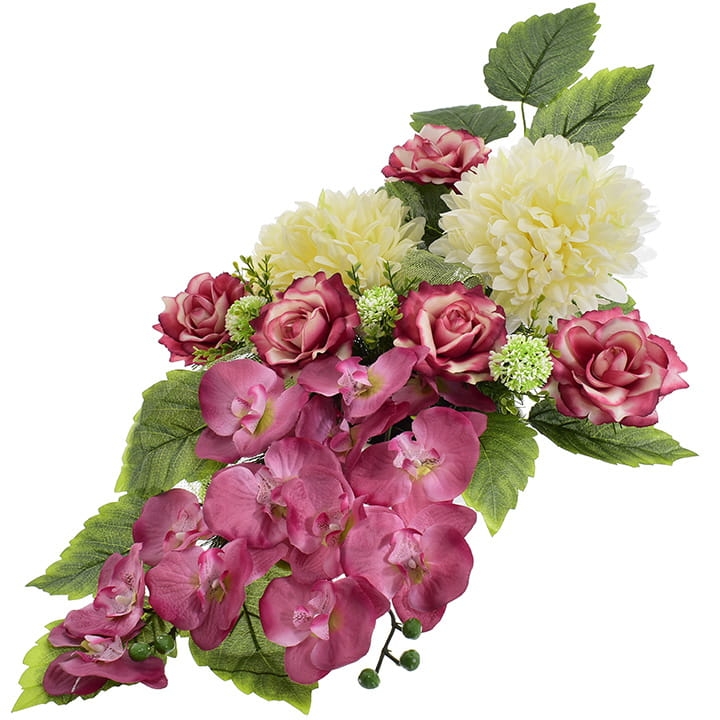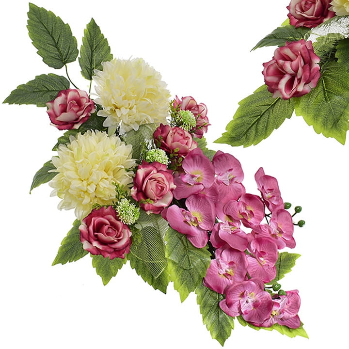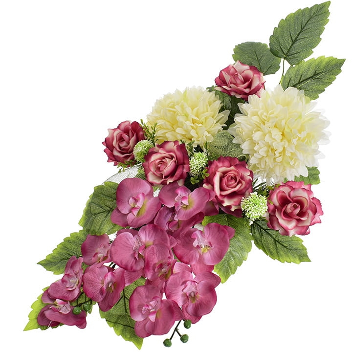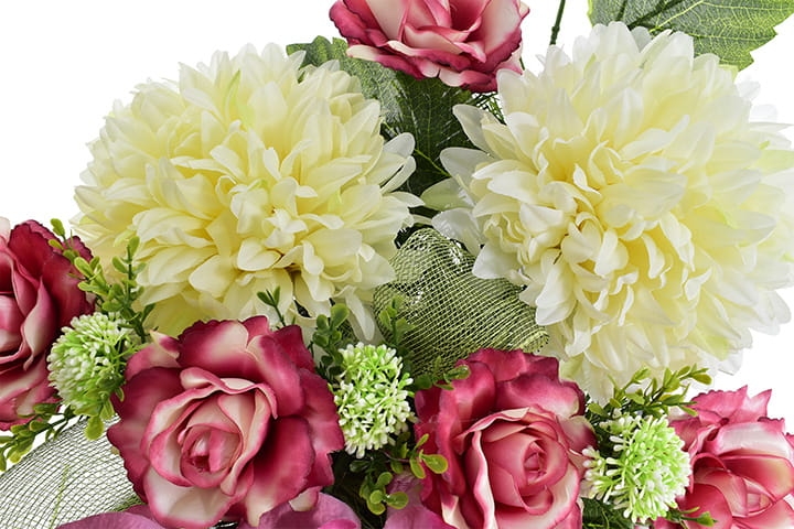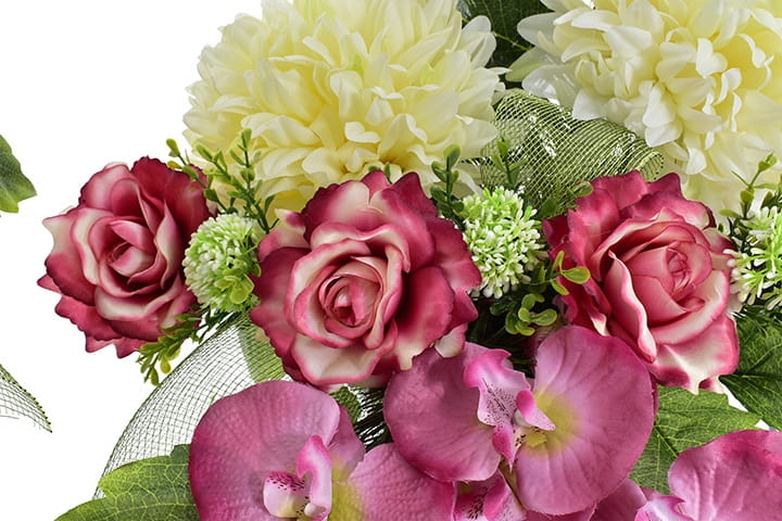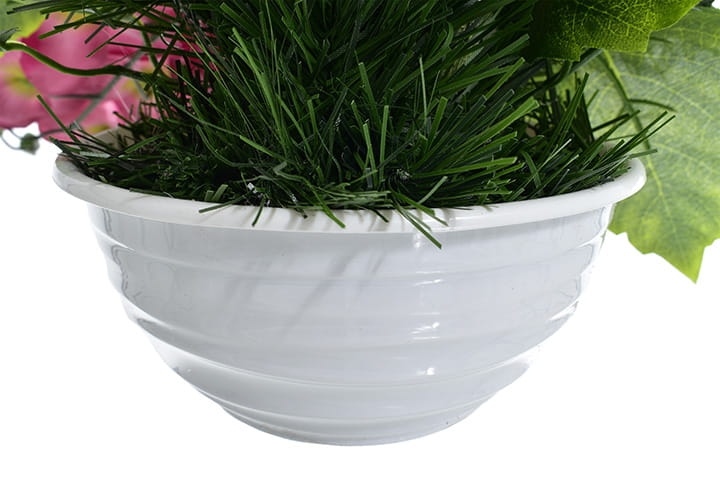 Dekoracja wykonana z najwyższej jakości sztucznych kwiatów, które został starannie ułożone w obciążonej doniczce, co pozwala na bezpieczne umieszczenie jej na grobie.