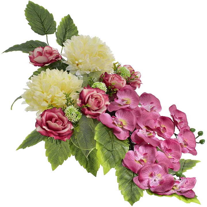 Niezwykle żywe kolory orchidei, chryzantem i eleganckich róż dodatkowo wzbogacone zielenią stworzą niezapomniany efekt wizualny na grobie Twojej ukochanej osoby.