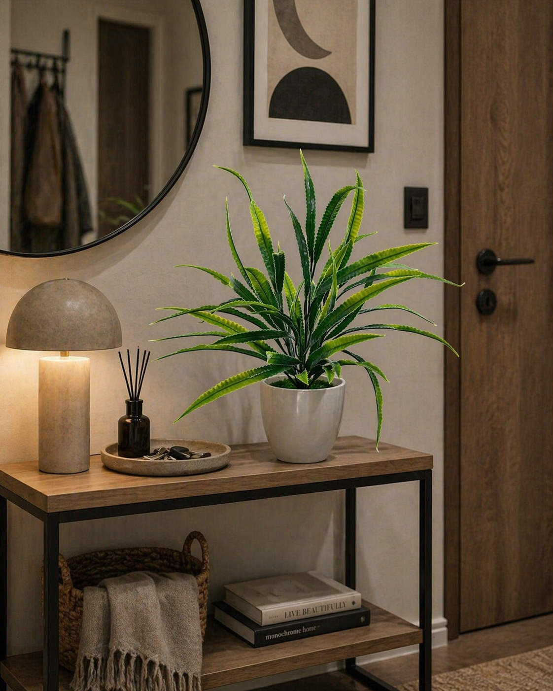 Dzięki wysokiej jakości wykonania stanowi trwałą, bezobsługową alternatywę dla żywych roślin – idealną zarówno do domu, jak i przestrzeni komercyjnych.