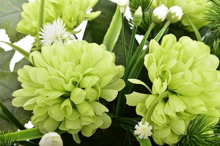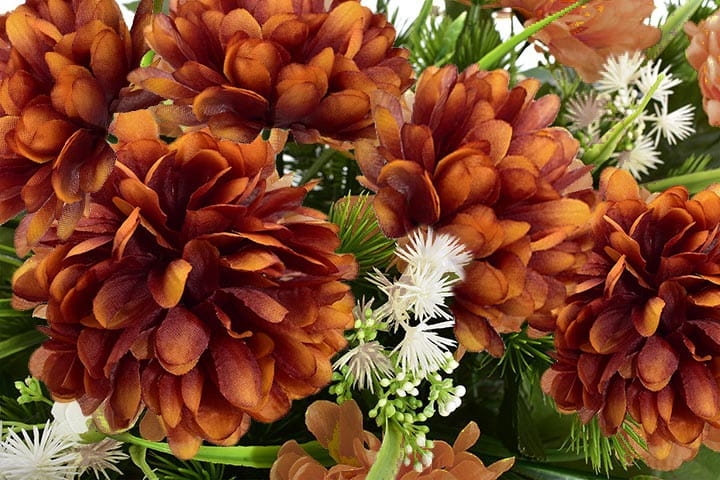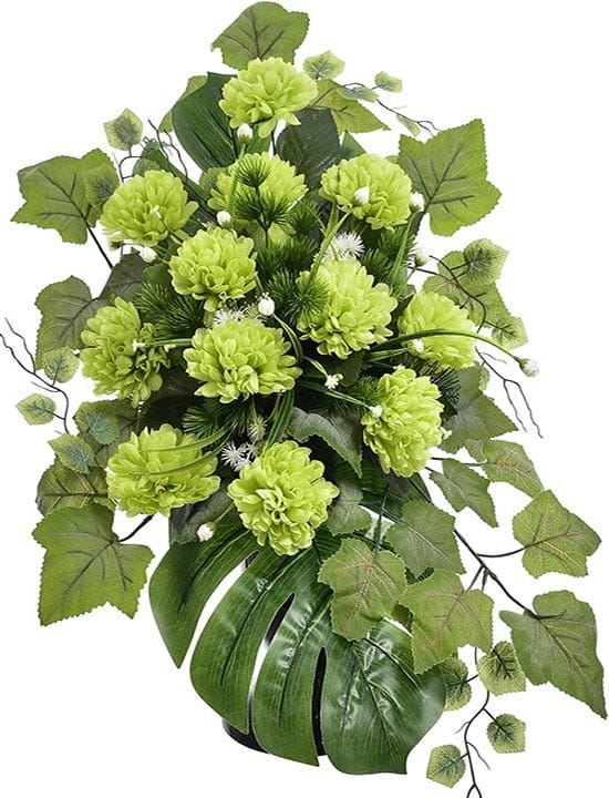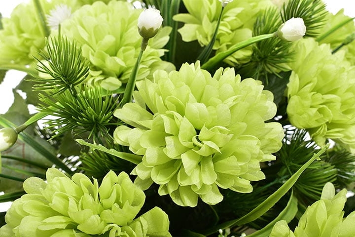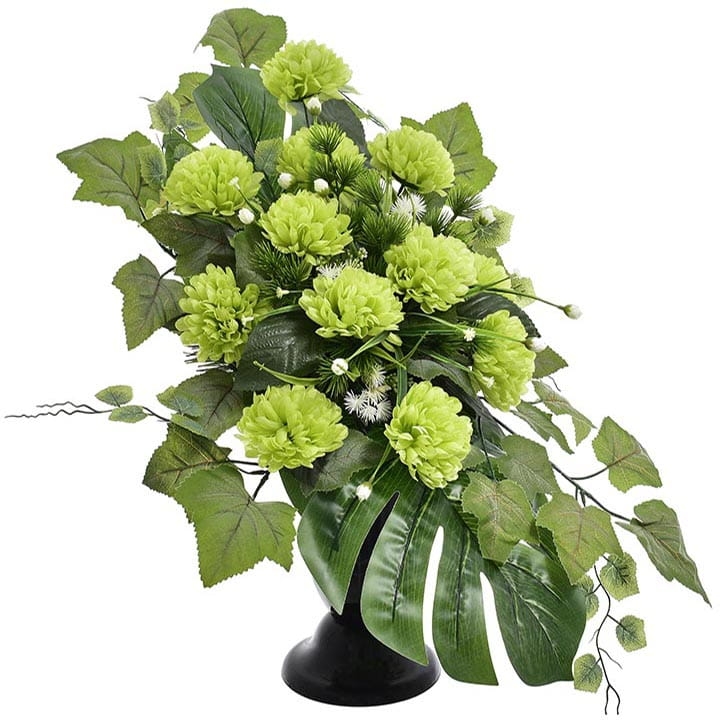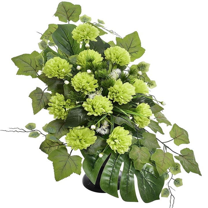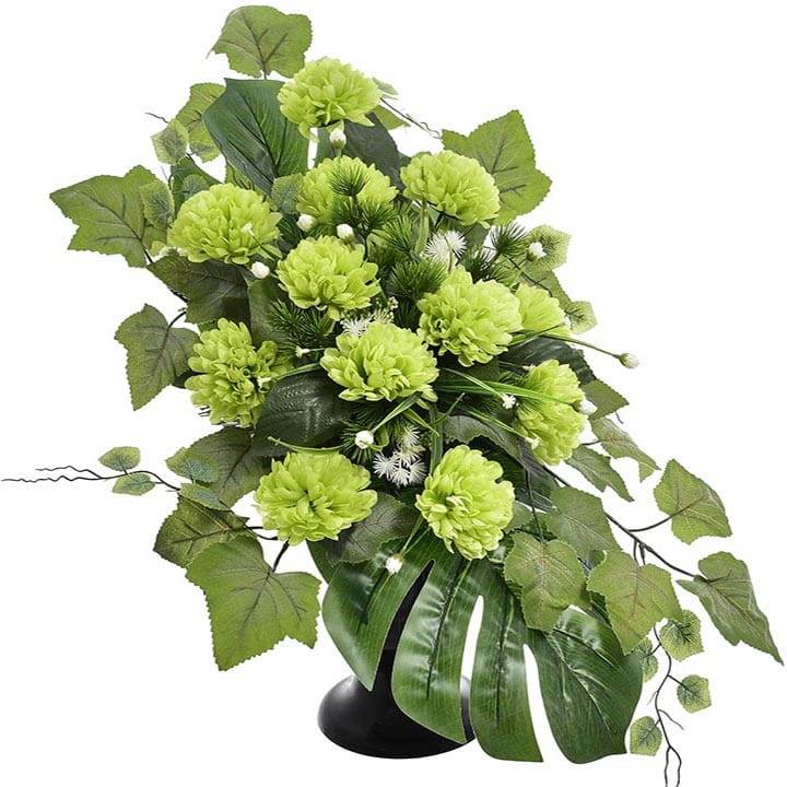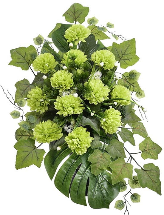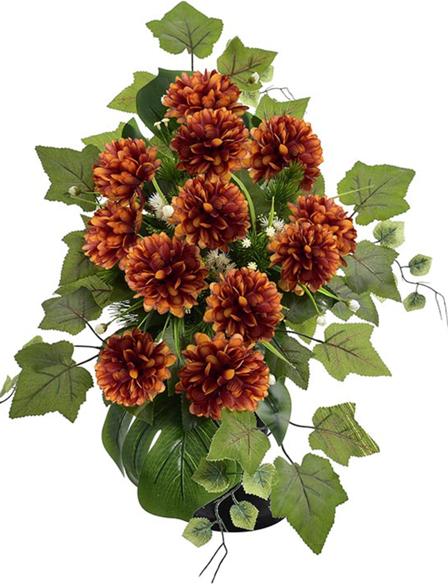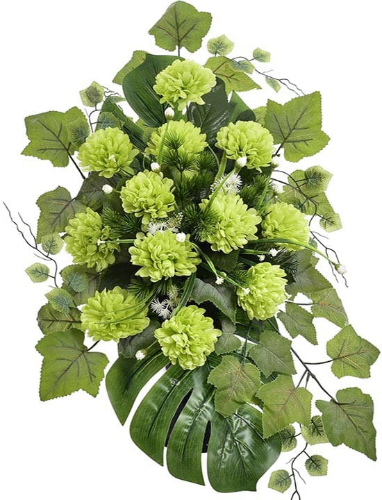 Dekoracja składa się z cudownych kwiatów chryzantemy oraz licznych zielonych dodatków.