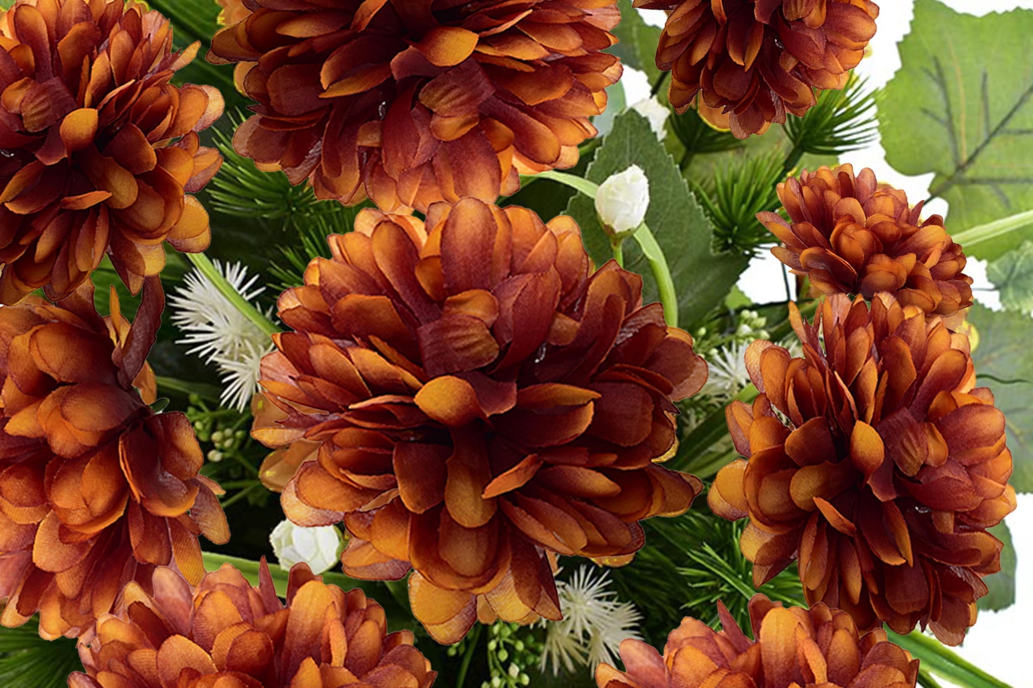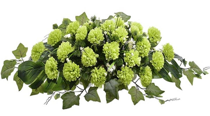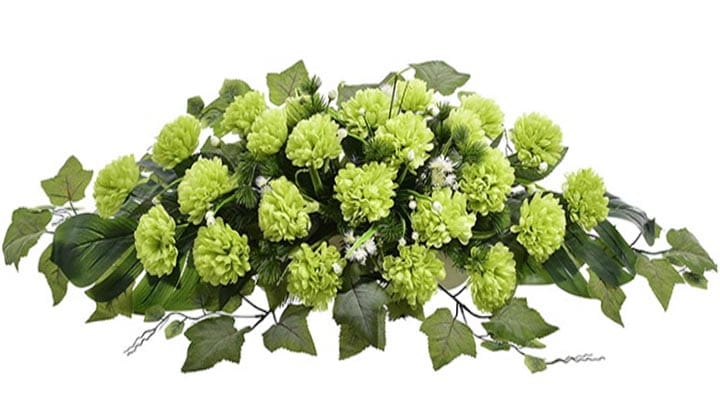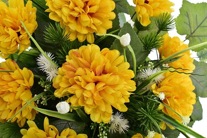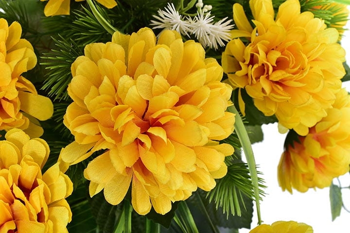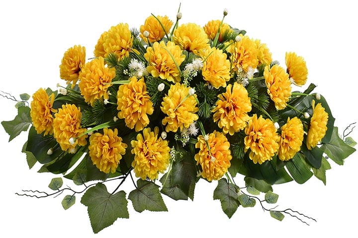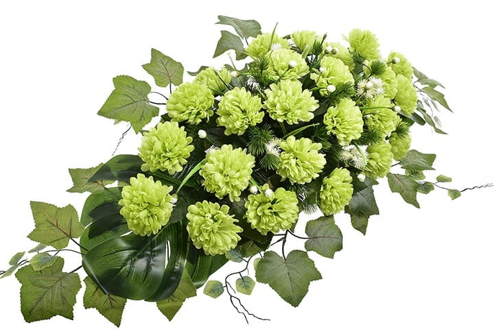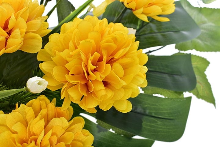Dekoracja składa się z cudownych kwiatów chryzantemy oraz licznych zielonych dodatków.
