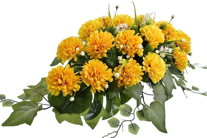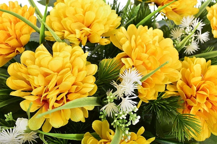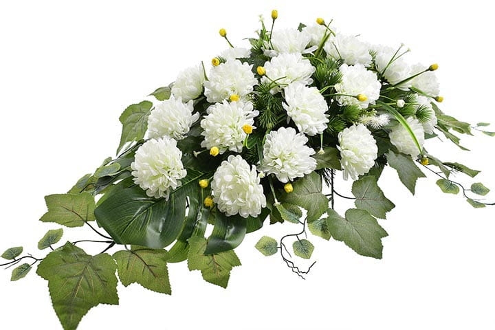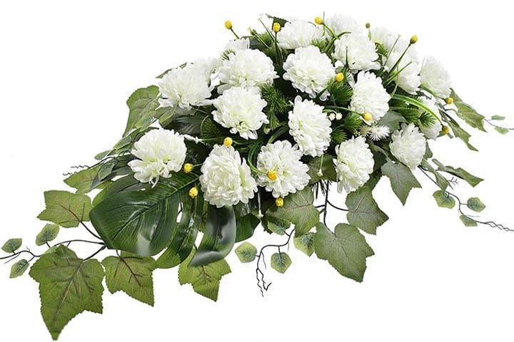 Przedstawiamy przepiękną kompozycję nagrobną wykonaną z wysokiej jakości sztucznych kwiatów, które gwarantują trwałość na lata.