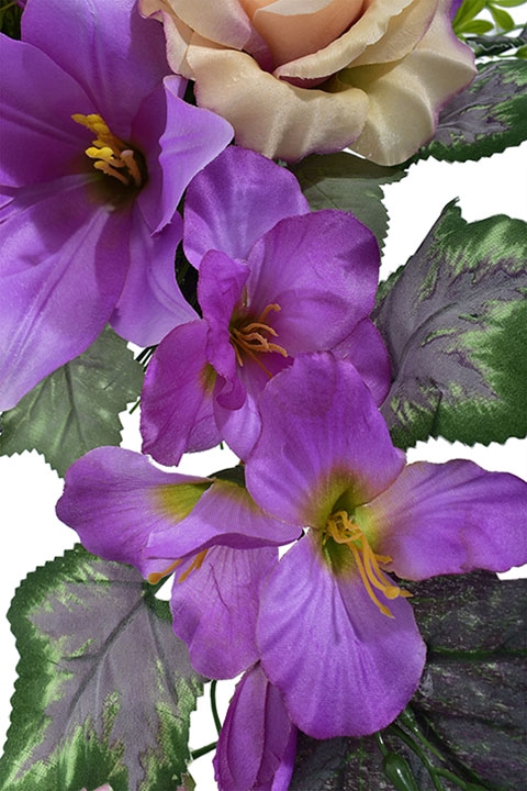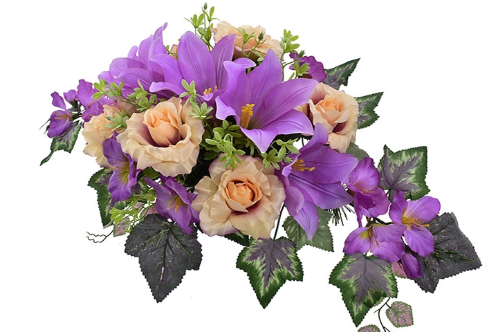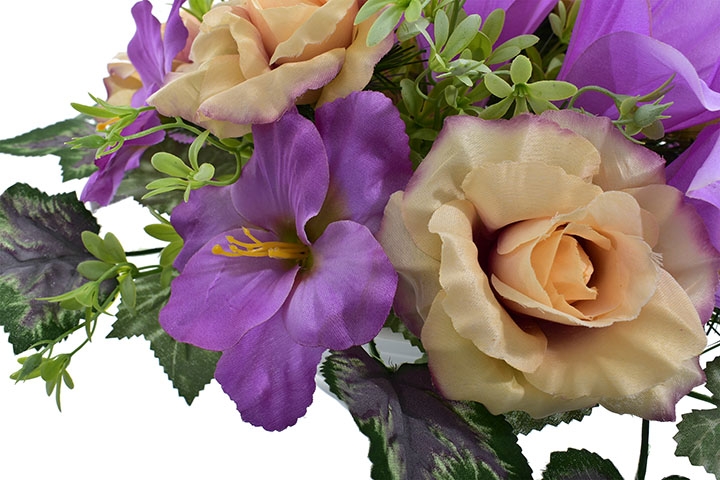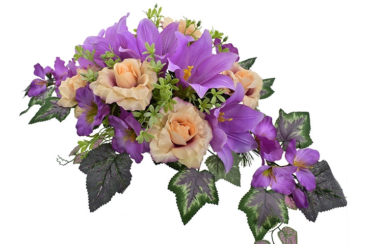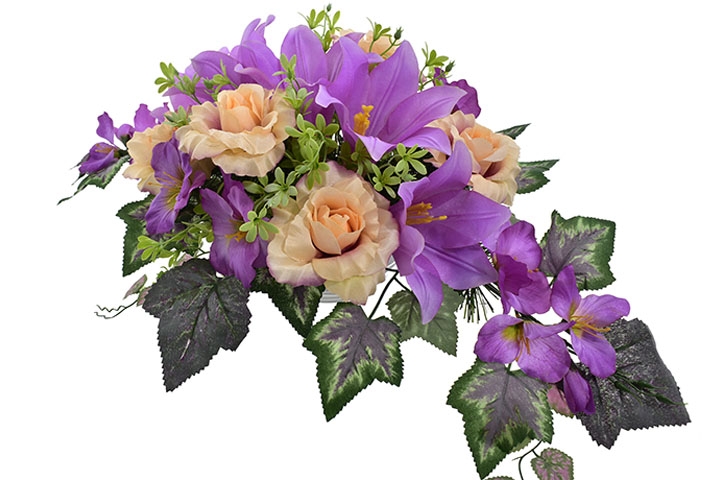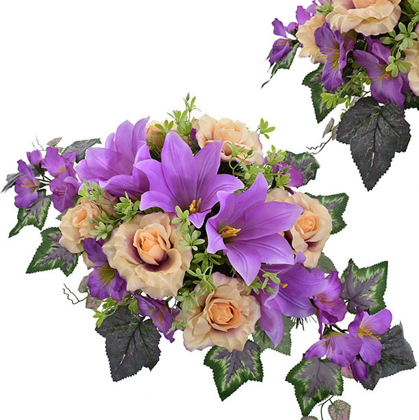 KOMPOZYCJA NAGROBNA – FIOLETOWO-BRZOSKWINIOWA ZE SZTUCZNYCH KWIATÓW - 75 CM