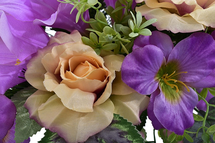 Kompozycja nagrobna – fioletowo-brzoskwiniowa ze sztucznych kwiatów