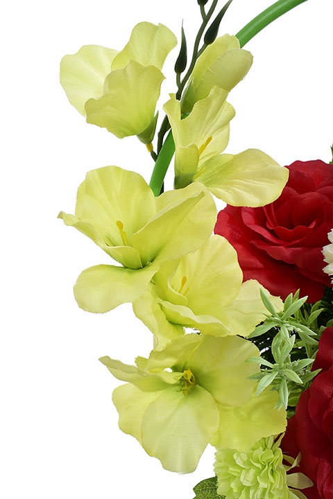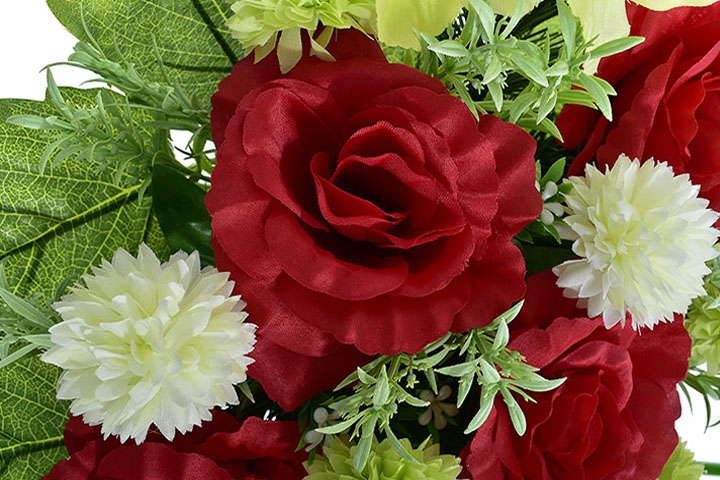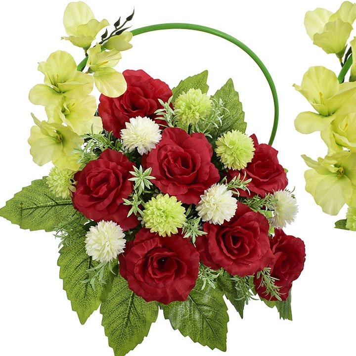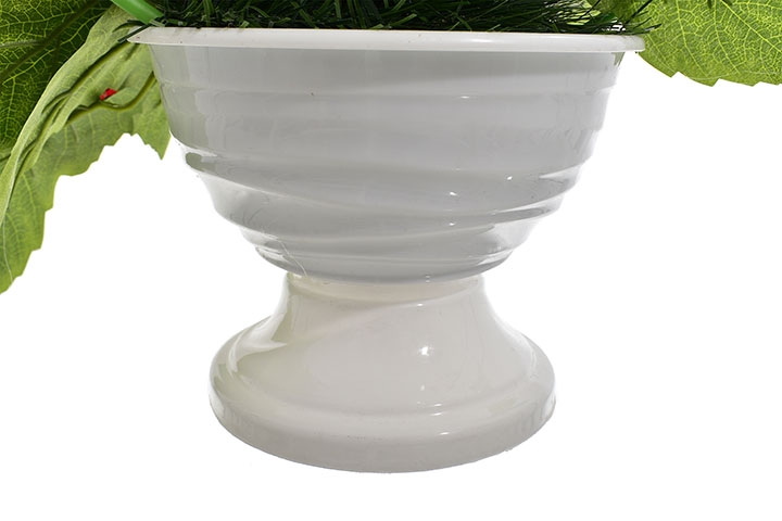 Wyjątkowa kompozycja ze sztucznych kwiatów umieszczona w stabilnej donicy z betonowym obciążeniem to trwała i elegancka ozdoba nagrobna.