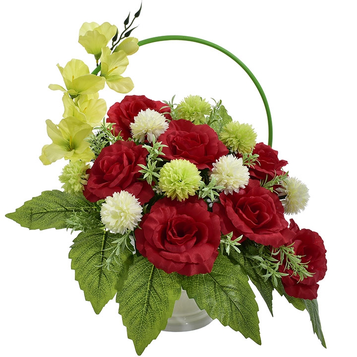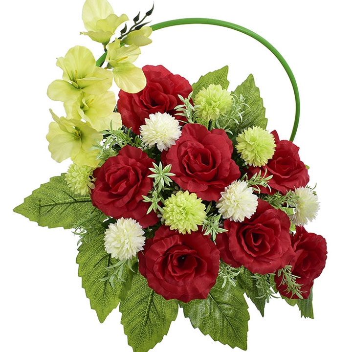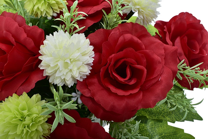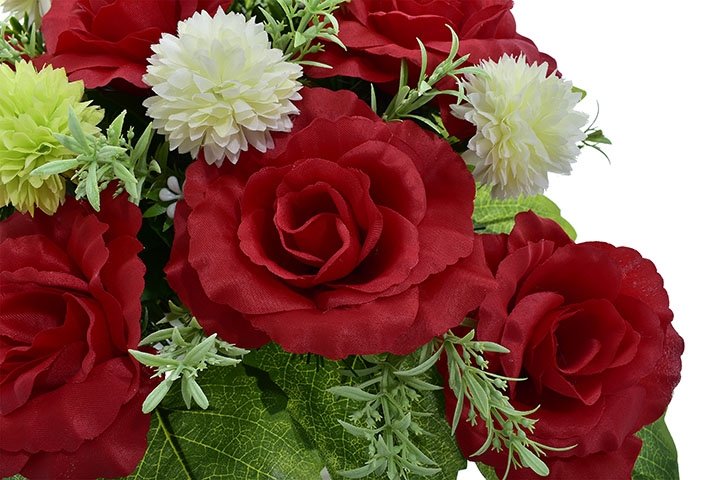 KOMPOZYCJA NAGROBNA W DONICY Z BETONOWYM OBCIĄŻENIEM – CZERWONE RÓŻE Z JASNYMI DODATKAMI