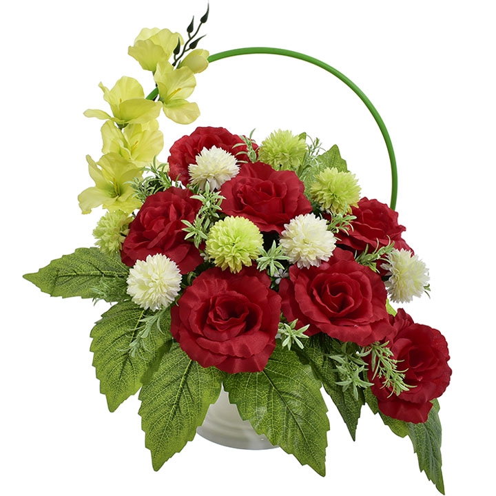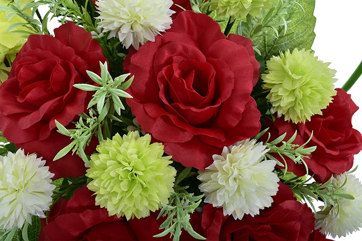 Połączenie głębokiej czerwieni róż z jasnymi, kremowo-seledynowymi dodatkami tworzy kontrastową, a zarazem harmonijną całość.