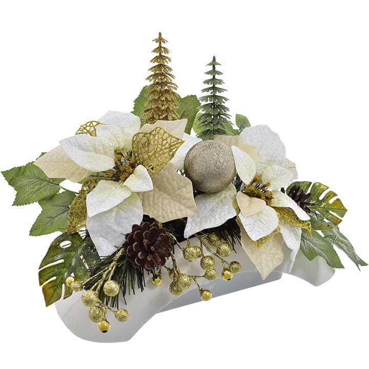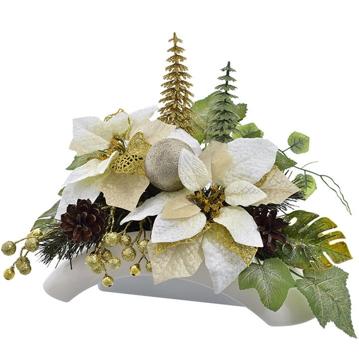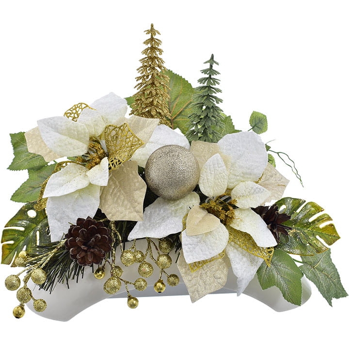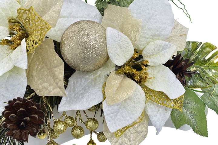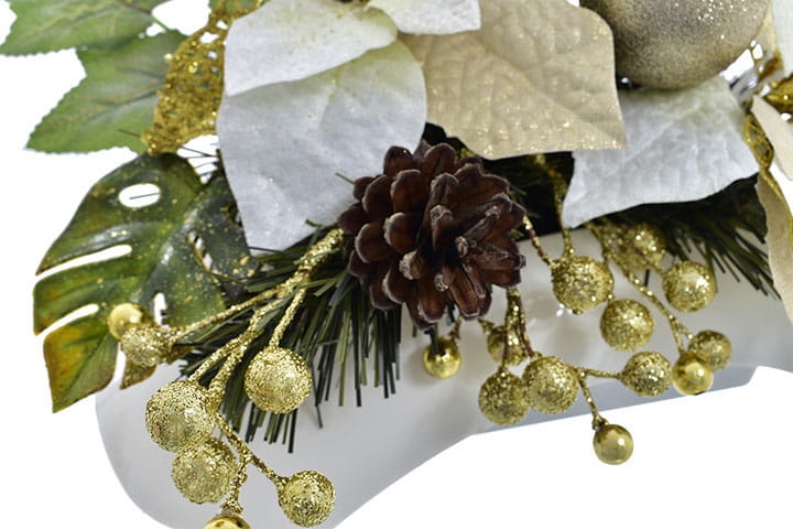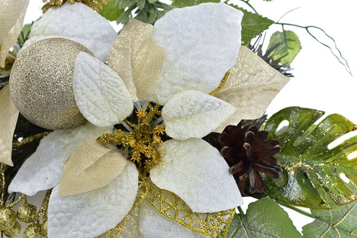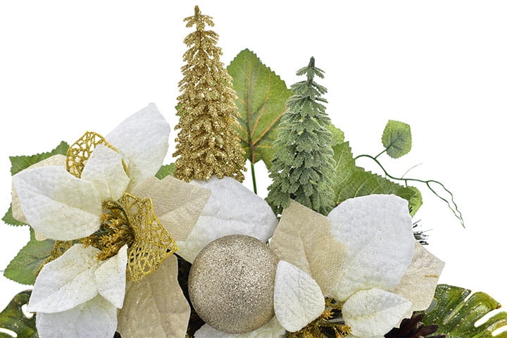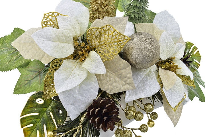 Kompozycja przyozdobiona kwiatami gwiazdy betlejemskiej, zielonymi liśćmi i świątecznymi dodatkami w bogato złotej kolorystyce.