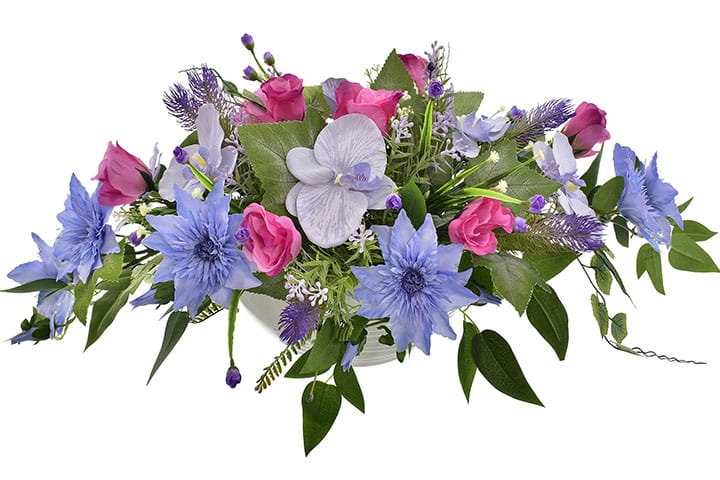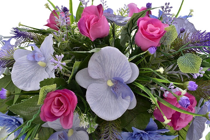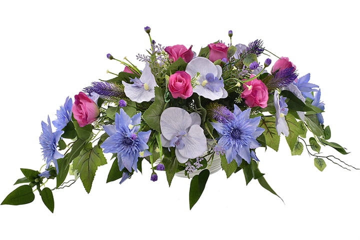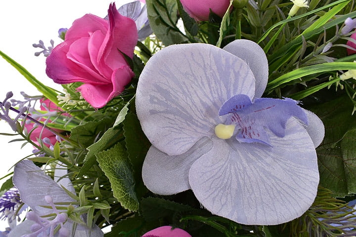 Niezwykle żywe kolory powojnika oraz storczyka dopełnione elegancją róż z pewnością przyciągną wzrok każdego.