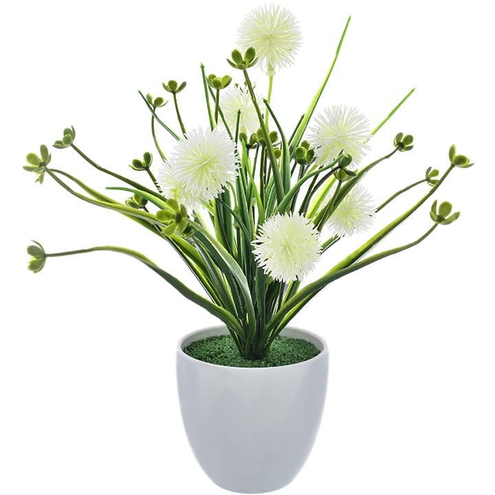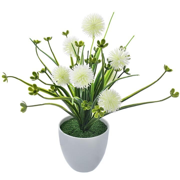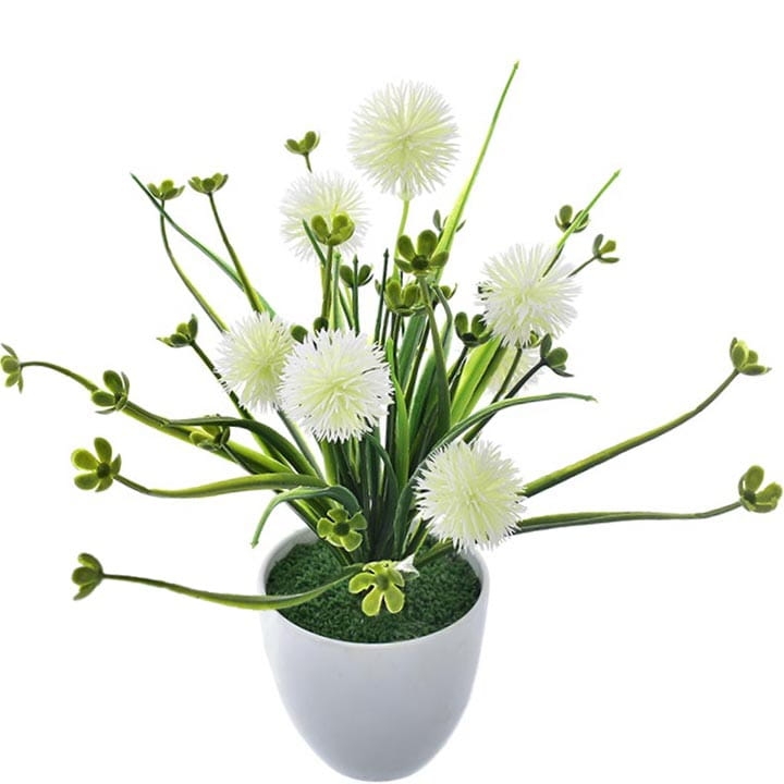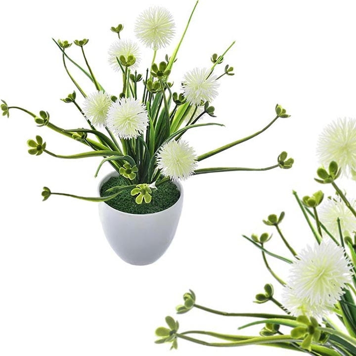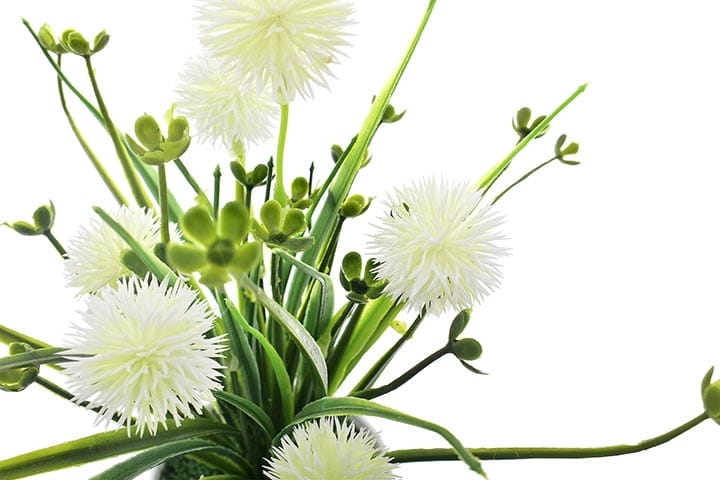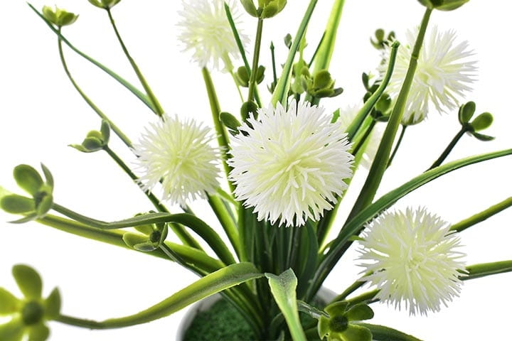 Ta kompozycja z białymi kulkami kwiatów to wyjątkowy pomysł do aranżacji wnętrz dla osób, które chcą otaczać się pięknymi roślinami.