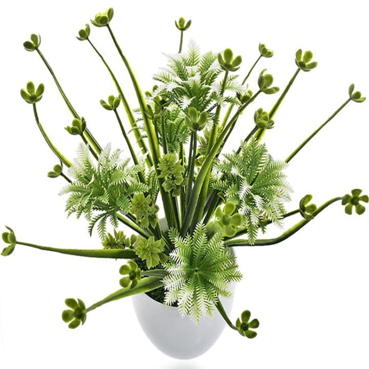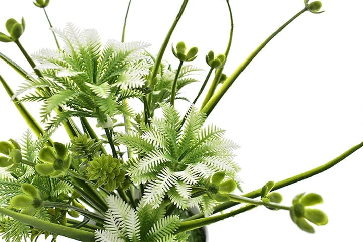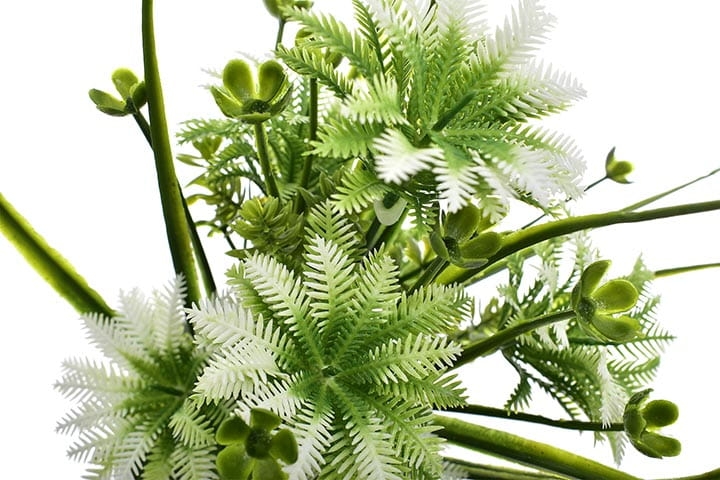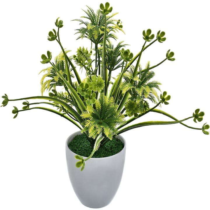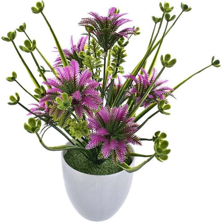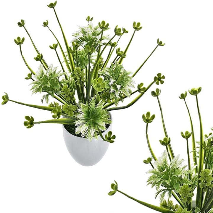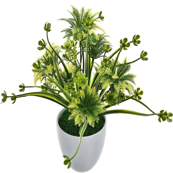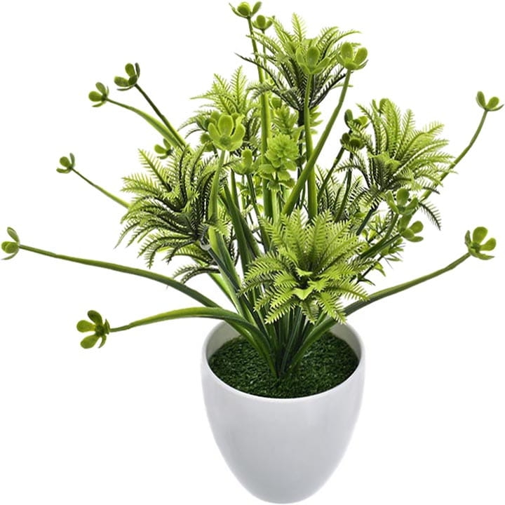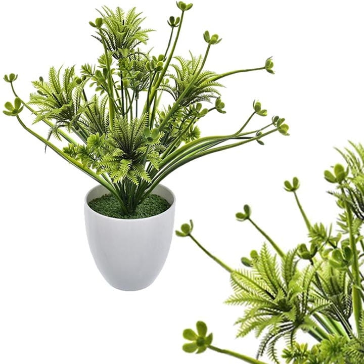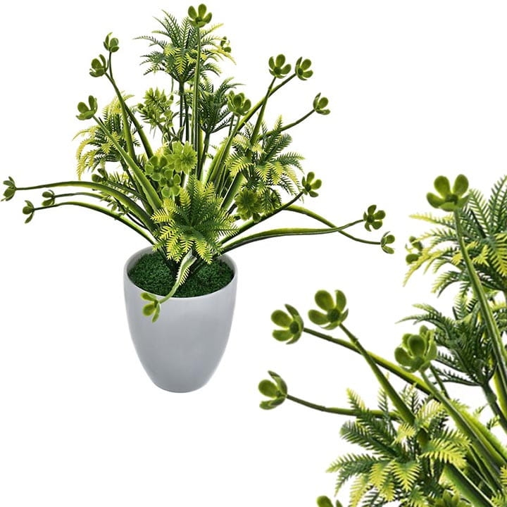 Elegancka, sztuczna roślina w białej doniczce to stylowa ozdoba każdego pomieszczenia.