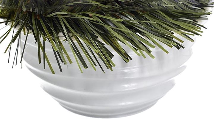 Kompozycja osadzona w okrągłej plastikowej doniczce zalanej betonem.