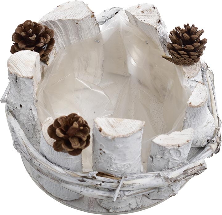 Pojemnik przyozdobiony naturalnymi szyszkami.