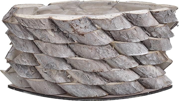 Osłonka w kształcie łódki wykonany z pociętych drewienek połączonych metalowymi gwoździkami.