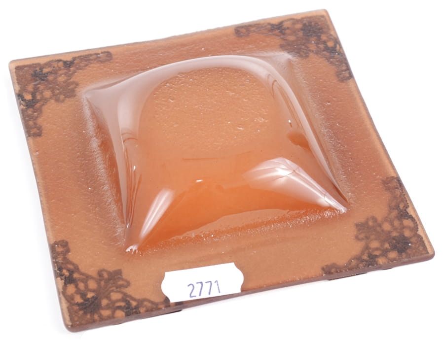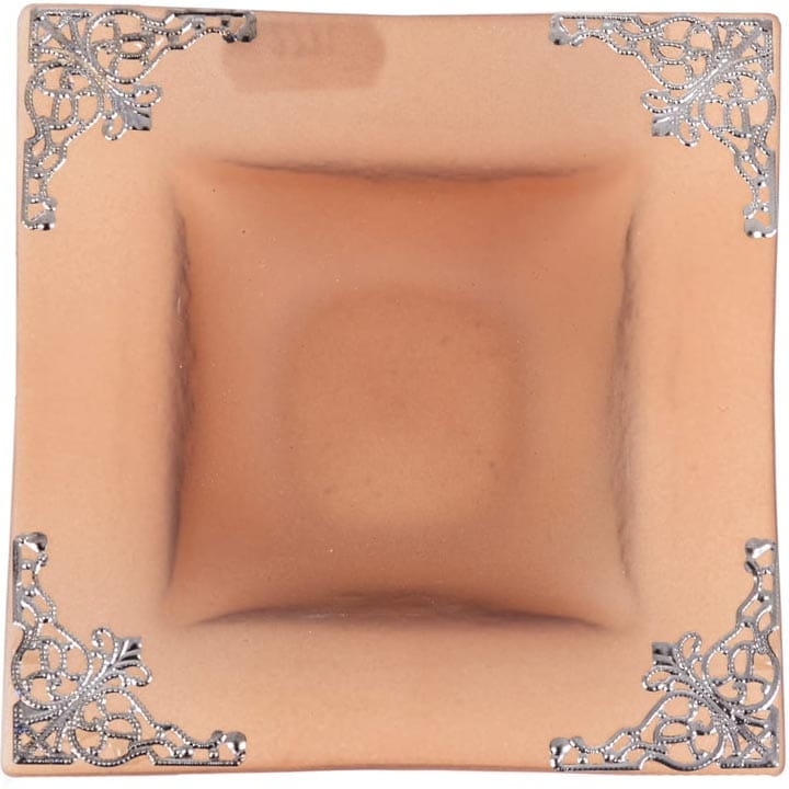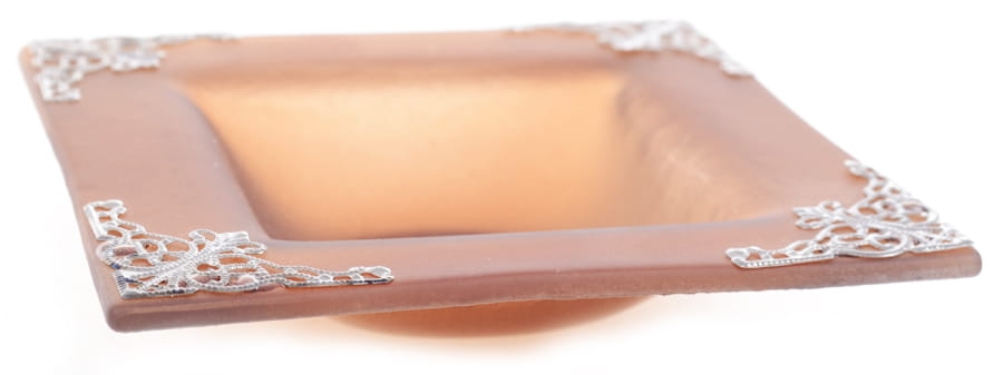 Podstawka kwadratowa wykonana ze szkła mrożonego w kolorze brązowym. Ozdobiona metalowymi elementami.