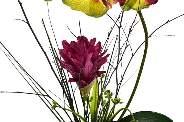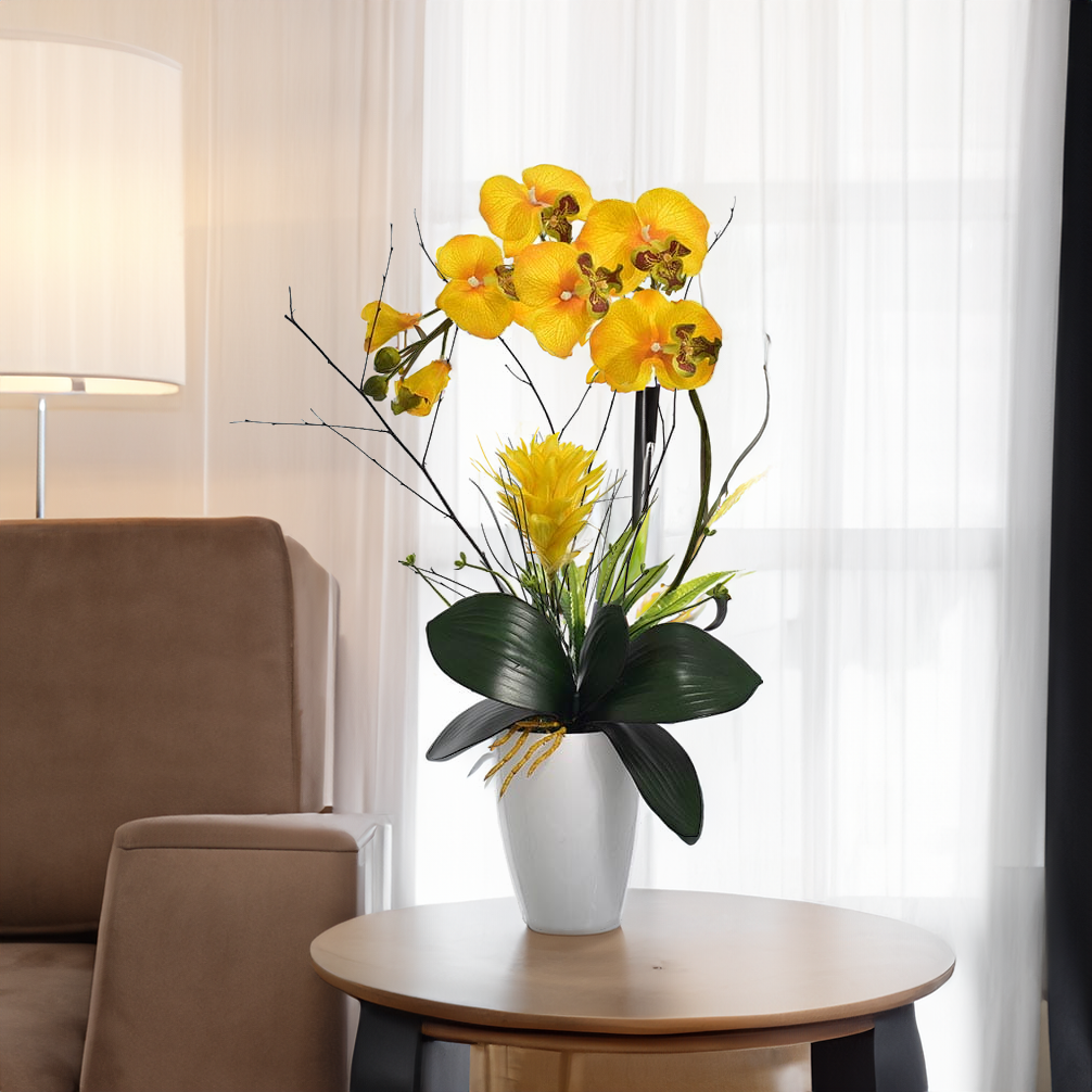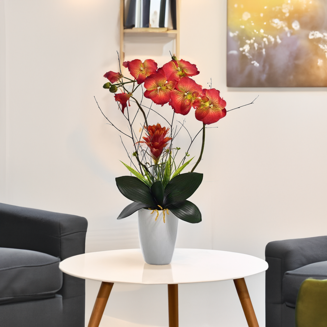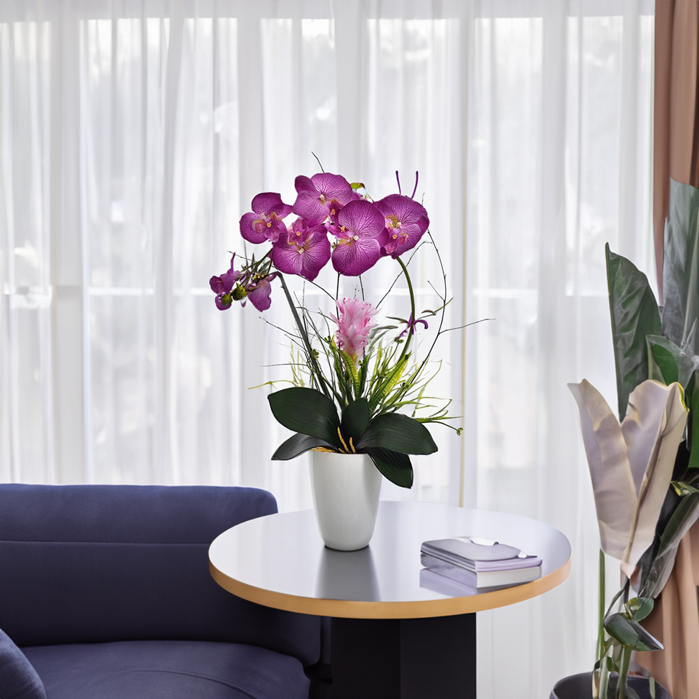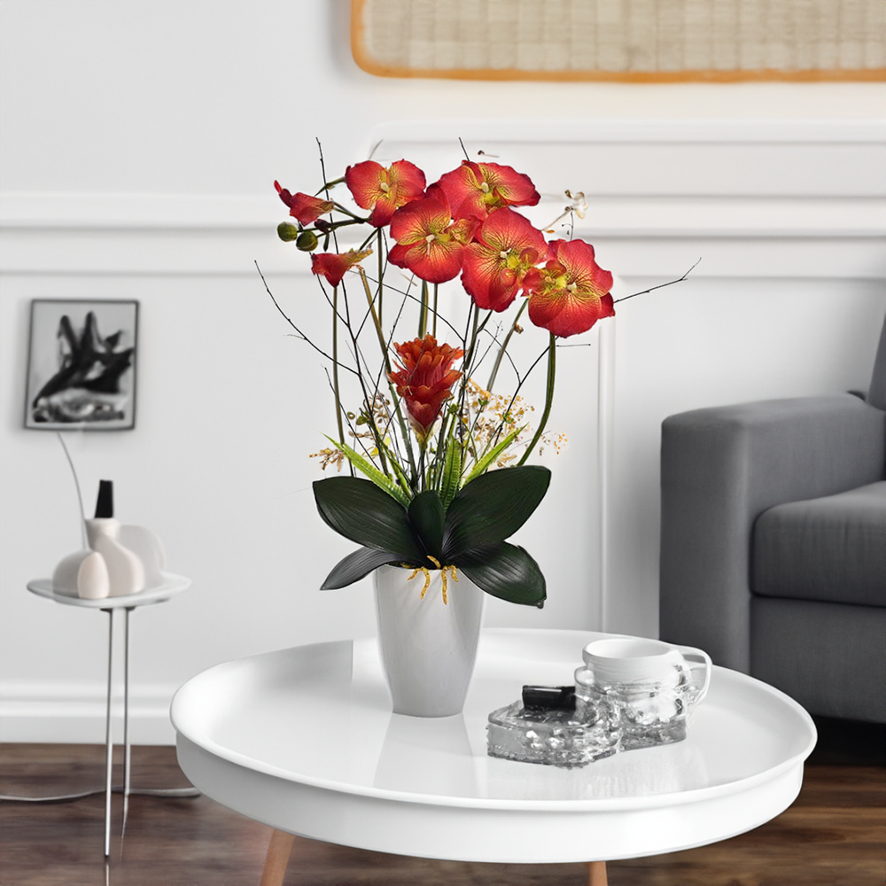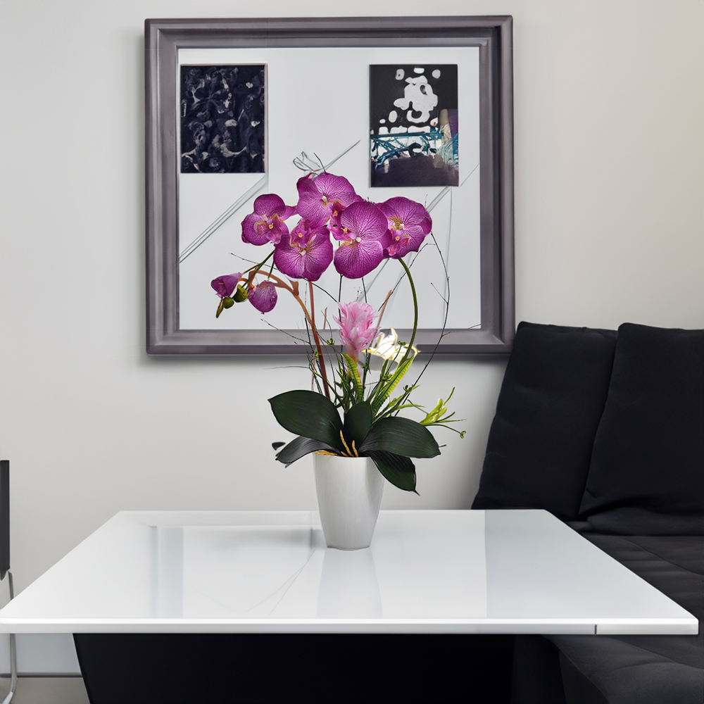 Kompozycja ze sztucznych kwiatów doskonale imituje piękno żywych storczyków i stanowi idealny element wystroju wnętrz.