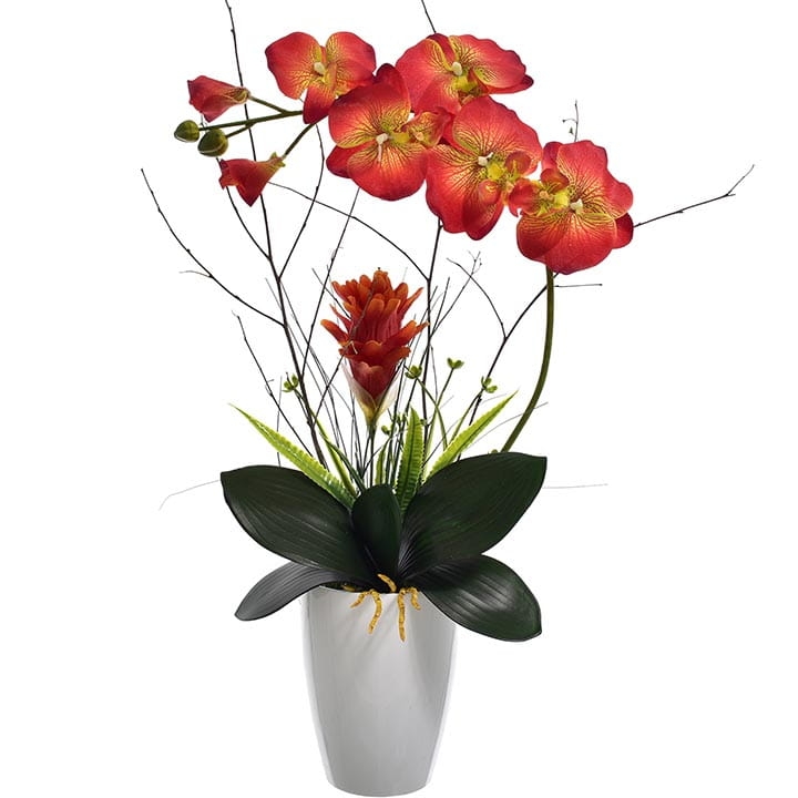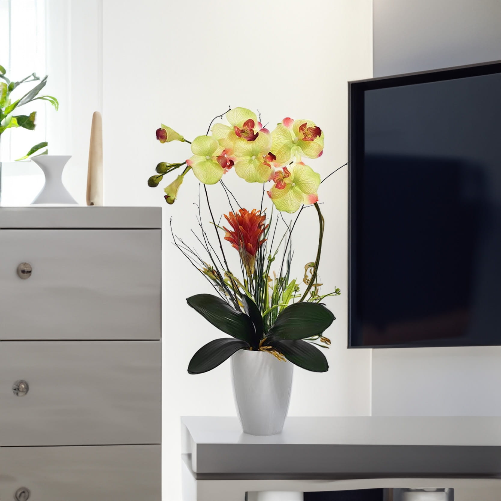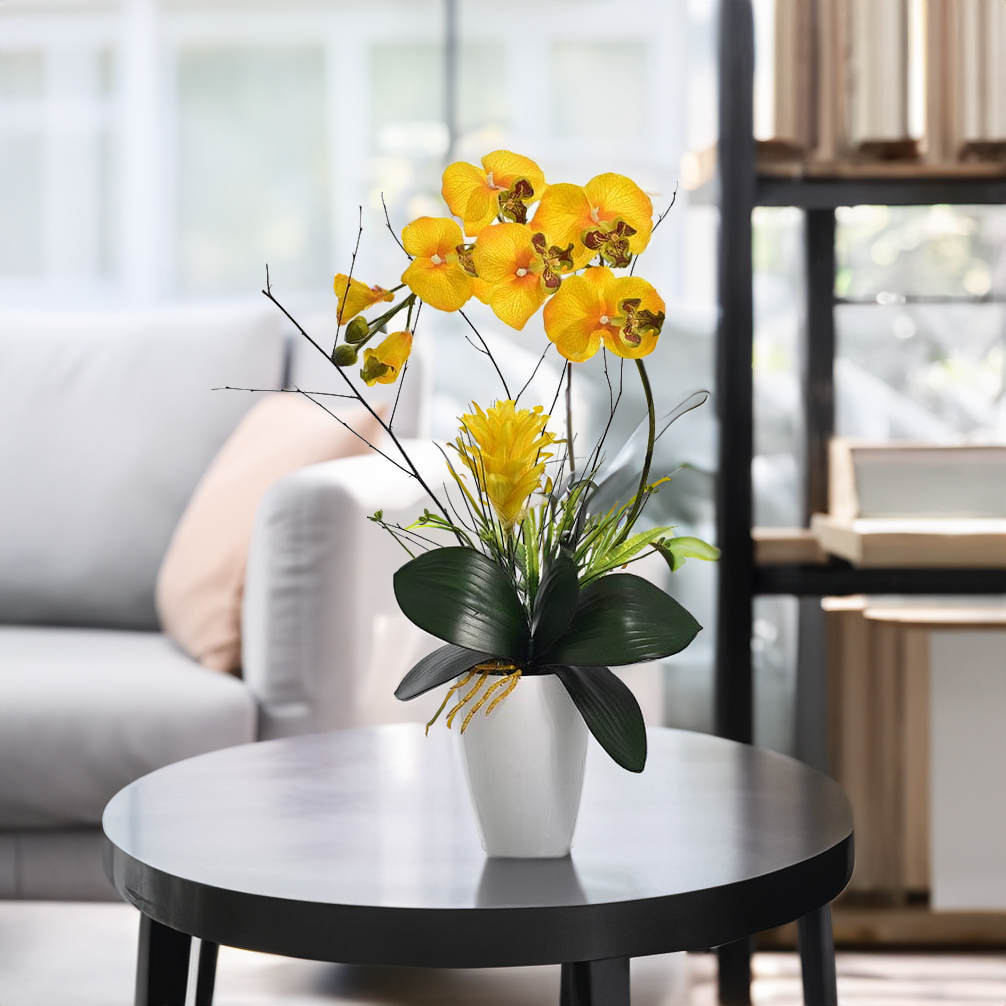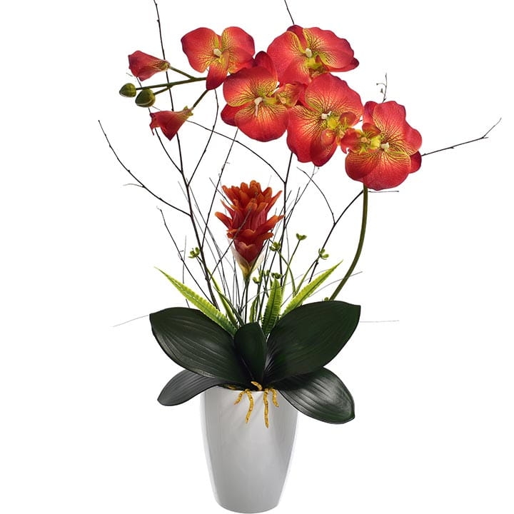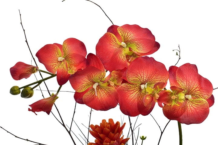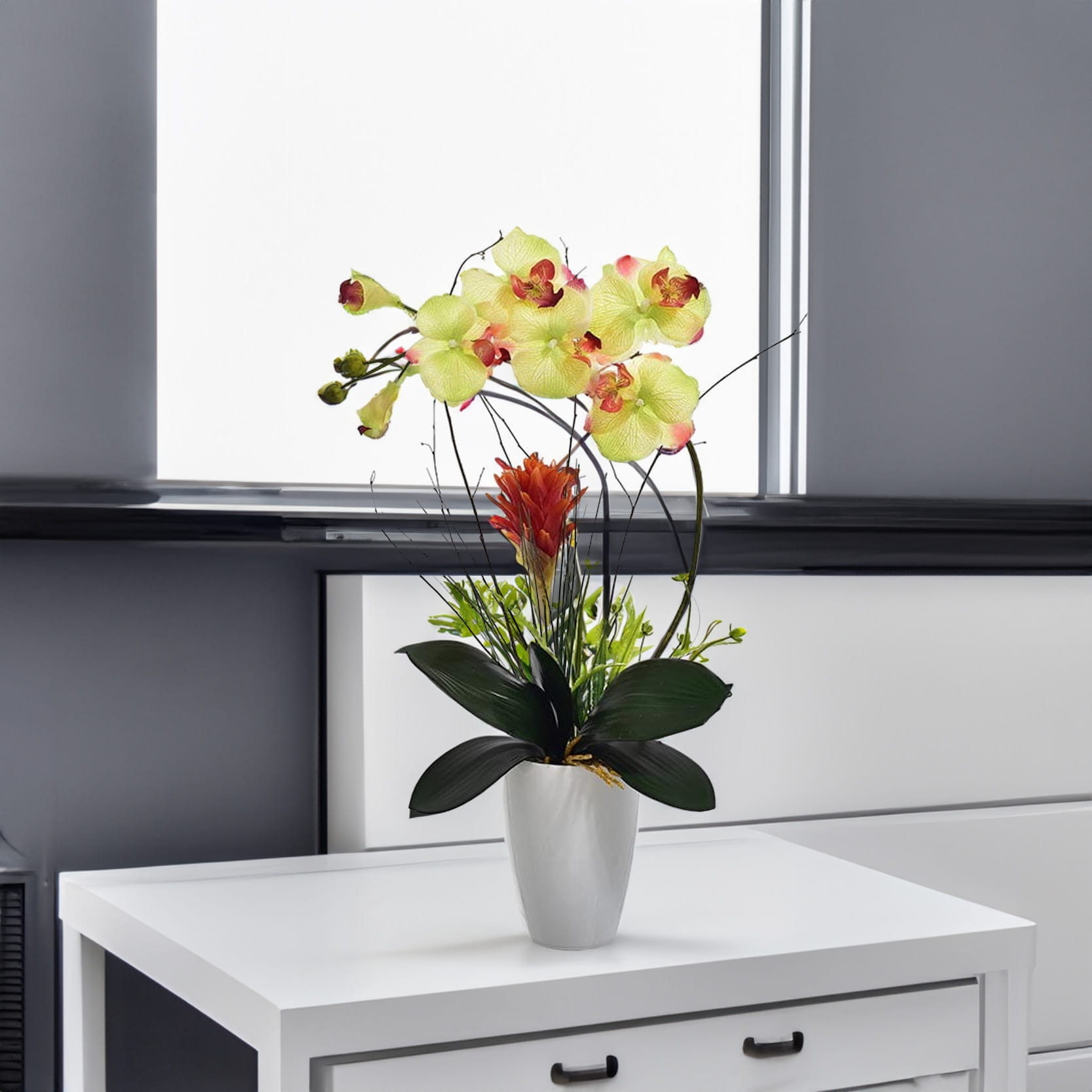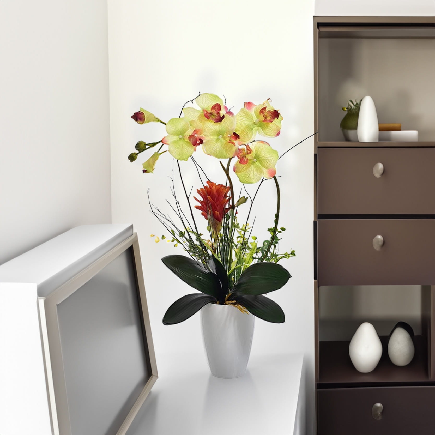 Kompozycja ze sztucznych kwiatów doskonale imituje piękno żywych storczyków i stanowi idealny element wystroju wnętrz.