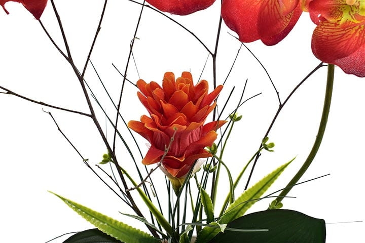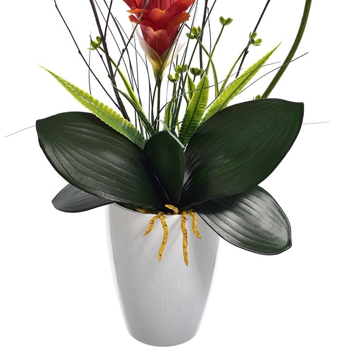 Elegancka kompozycja wykonana z kwiatu storczyka, kwiatu ananasa oraz liści z korzeniami.