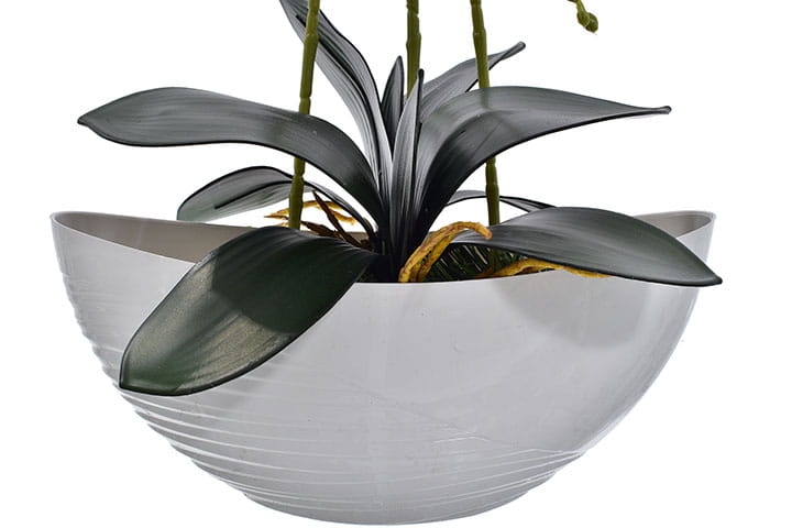 Doniczka z połyskiem w kształcie łódki nadaje kompozycji nowoczesnego designu.