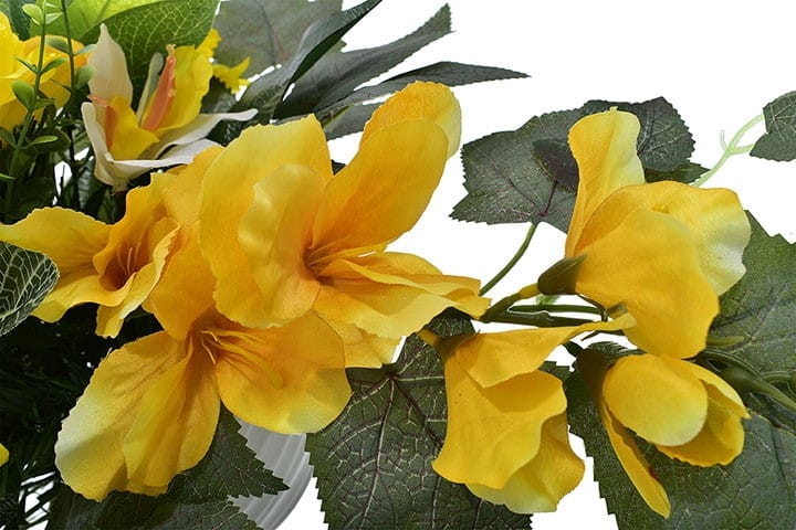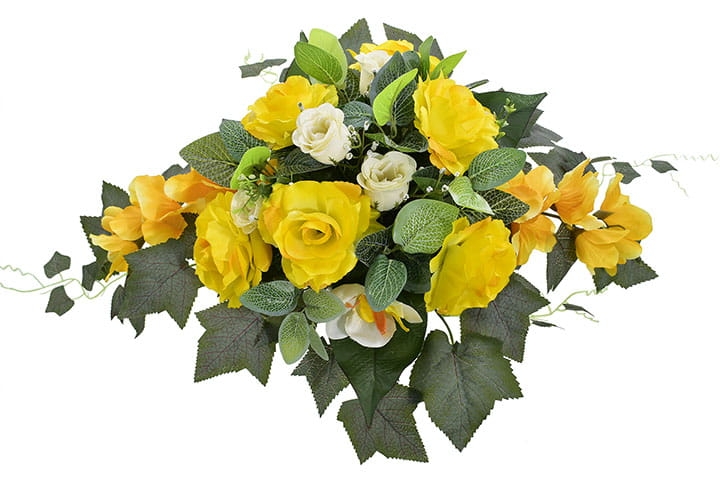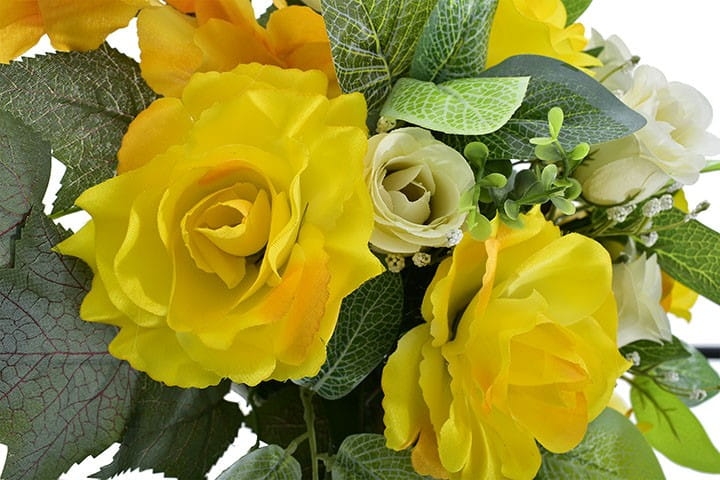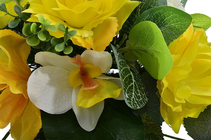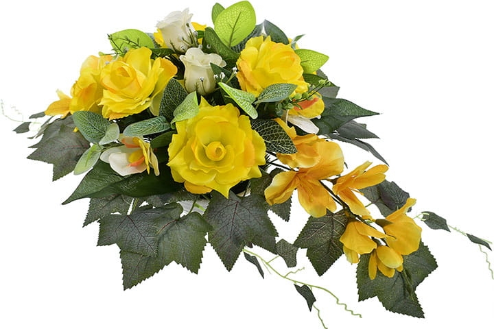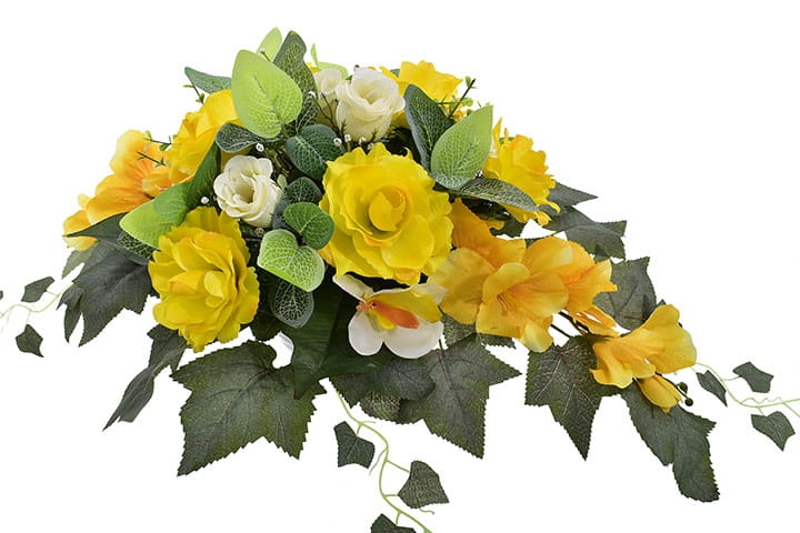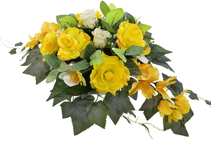 Okazała i pełna elegancji kompozycja nagrobna wykonana z wysokiej jakości sztucznych kwiatów w odcieniach żółtego i bieli, to wyjątkowy sposób, by z szacunkiem i klasą upamiętnić bliskich.